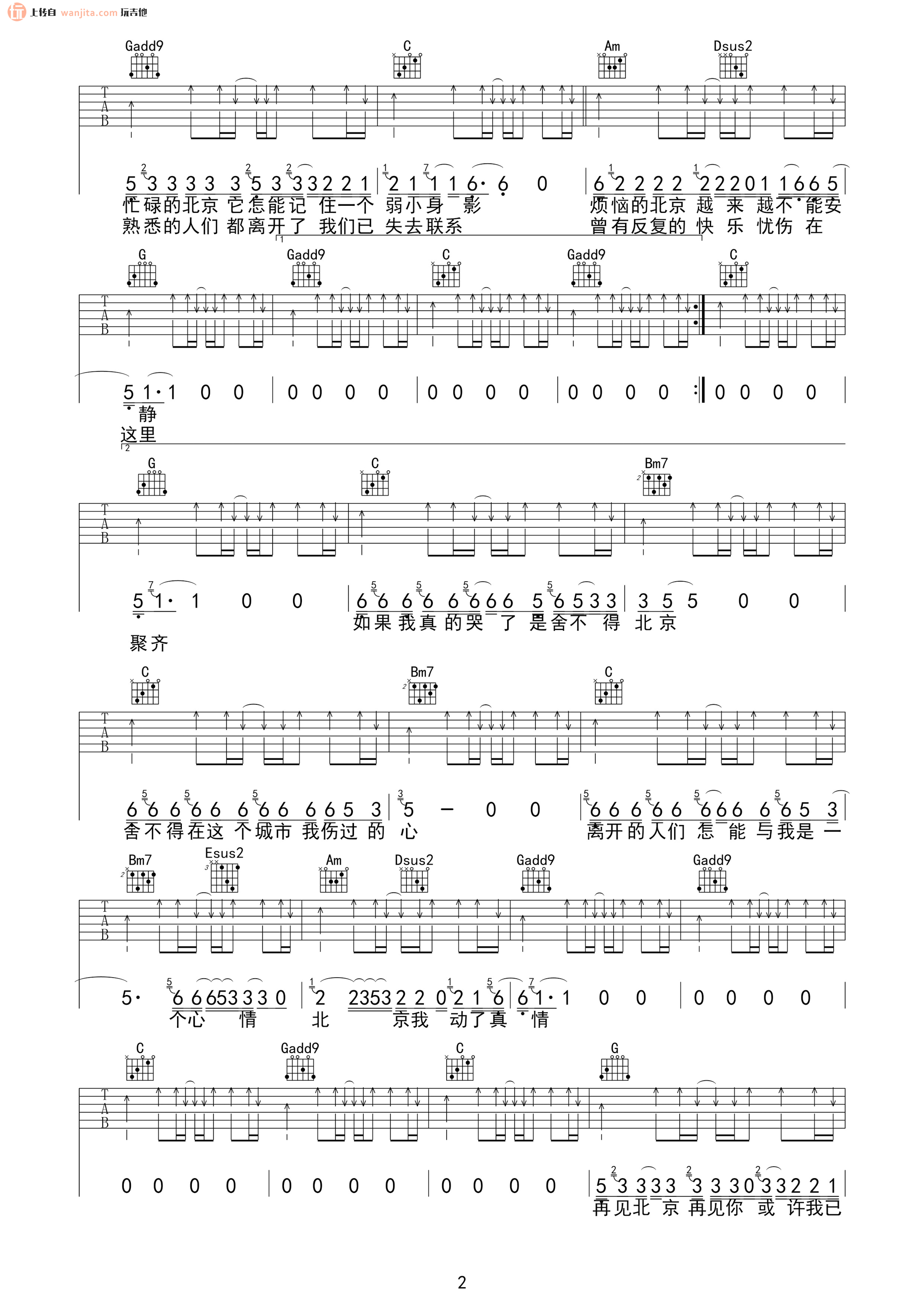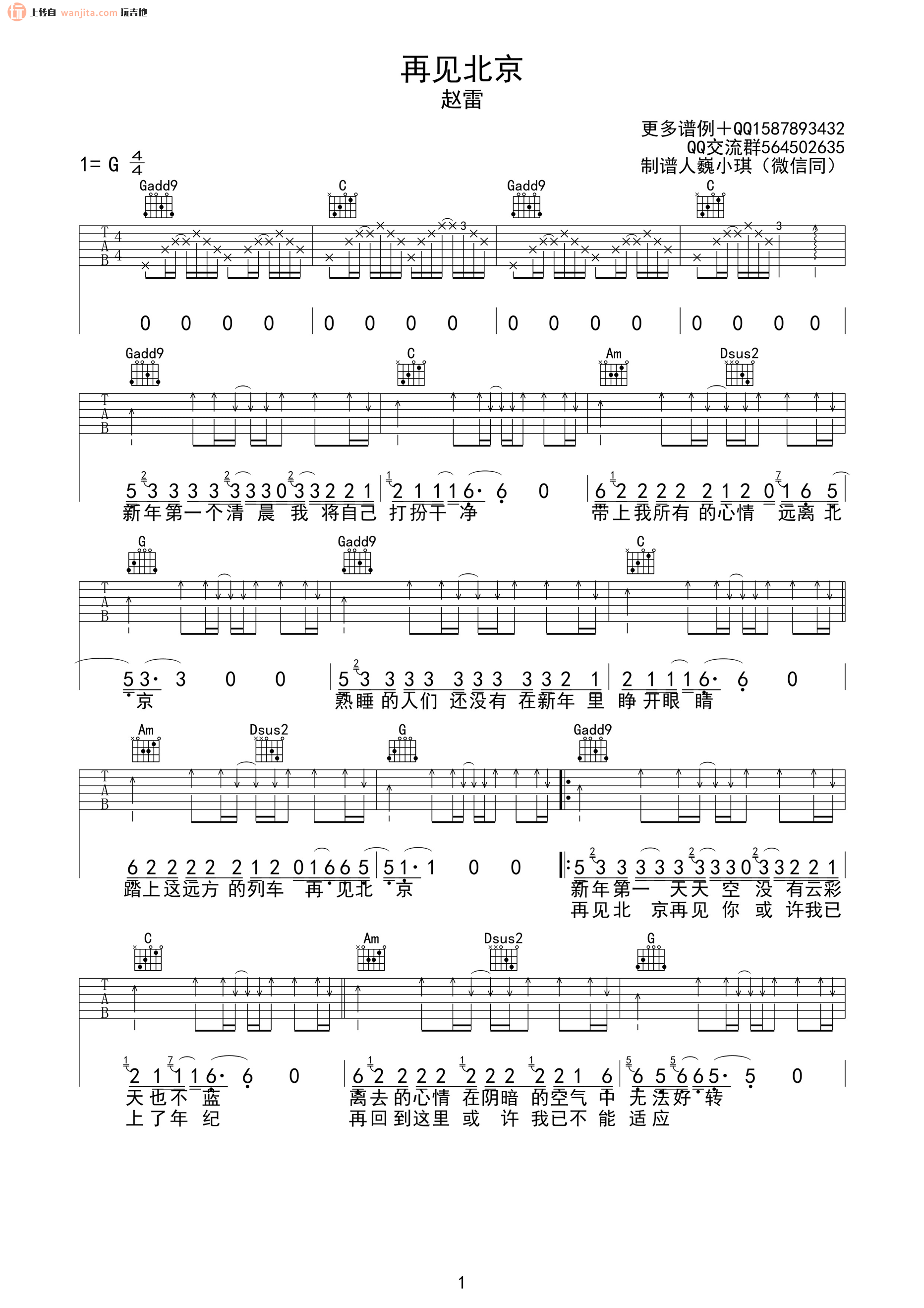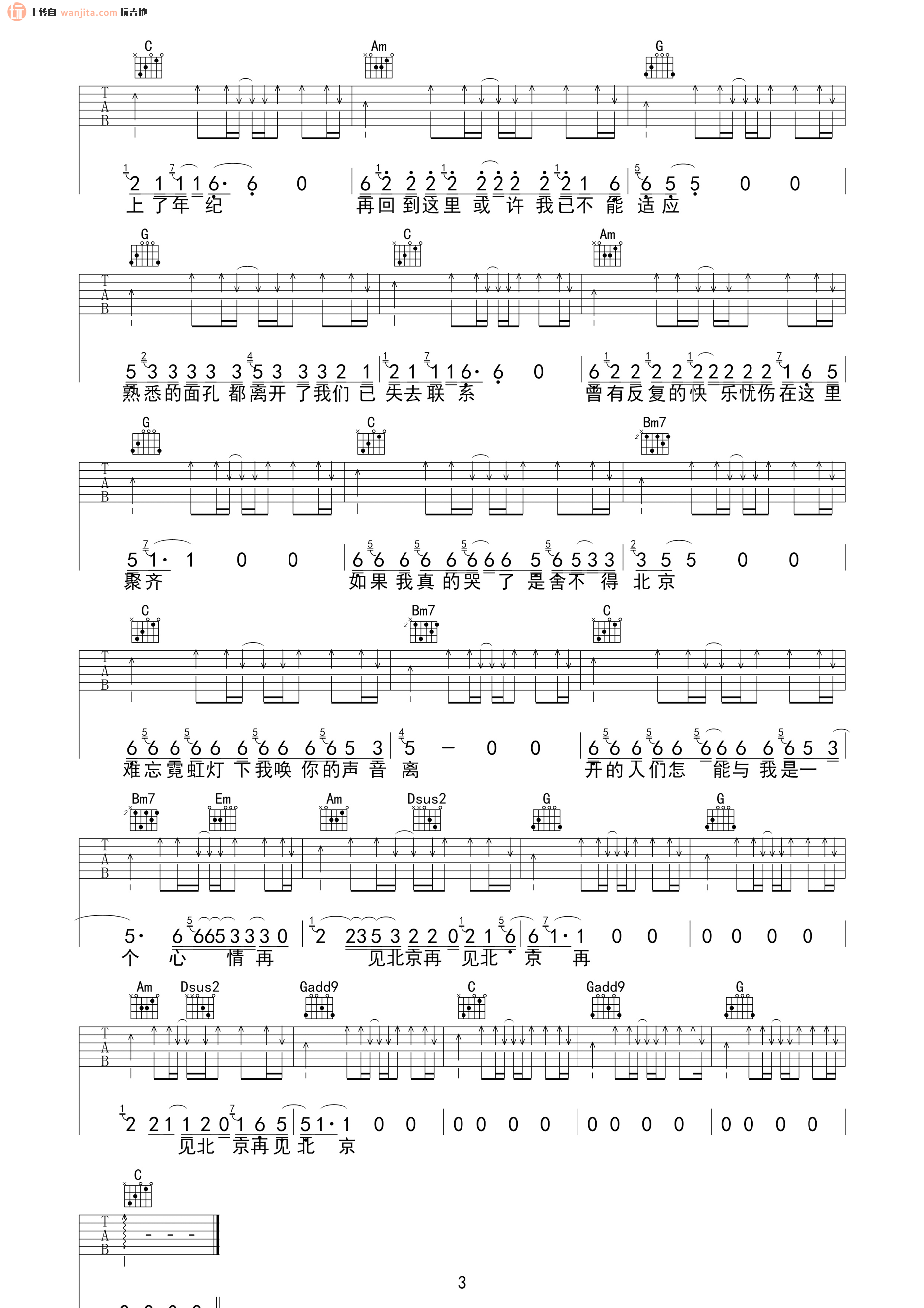 曲谱介绍: 再见北京吉他谱,总共3张高清图片谱,选用G调指法,节拍4/4拍,不使用变调夹,弹唱难度初级。