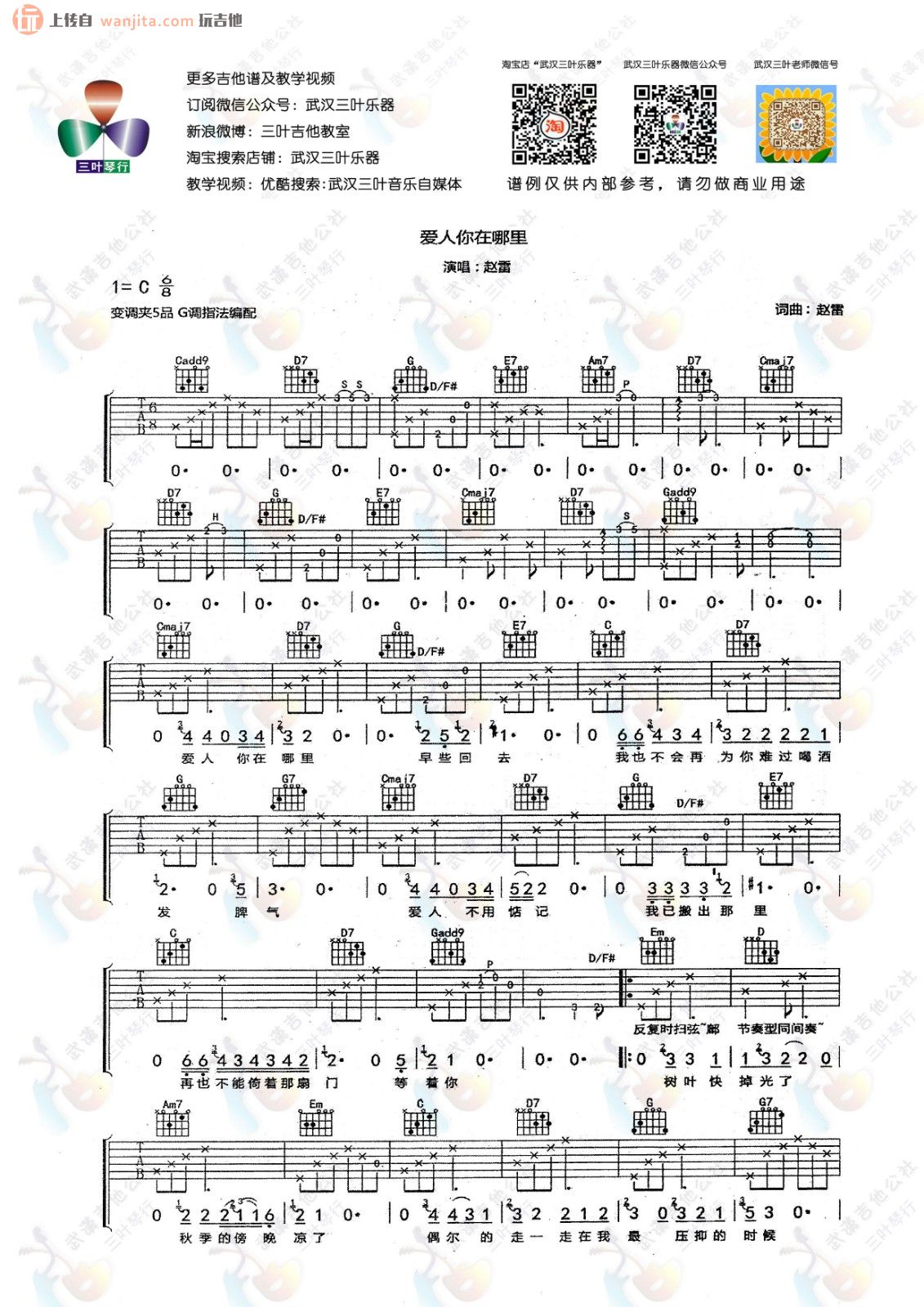 曲谱介绍: 爱人你在哪里吉他谱,总共3张高清图片谱,原调为C调,节拍6/8拍,弹唱建议变调夹夹5品,用G调指法编配,弹唱难度初级。