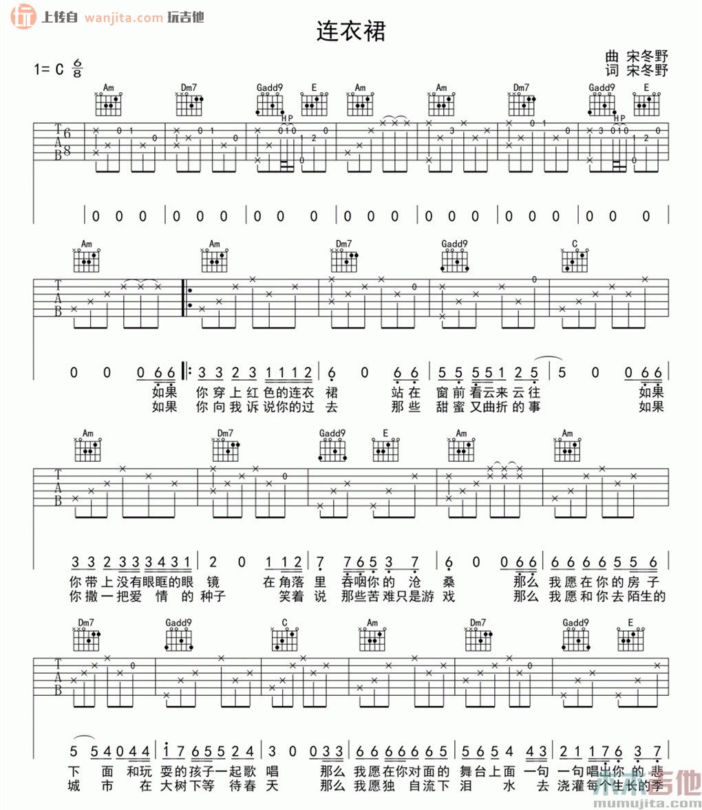 曲谱介绍: 宋冬野《连衣裙》吉他弹唱谱,共有2张高清图谱,免翻页排版设计。