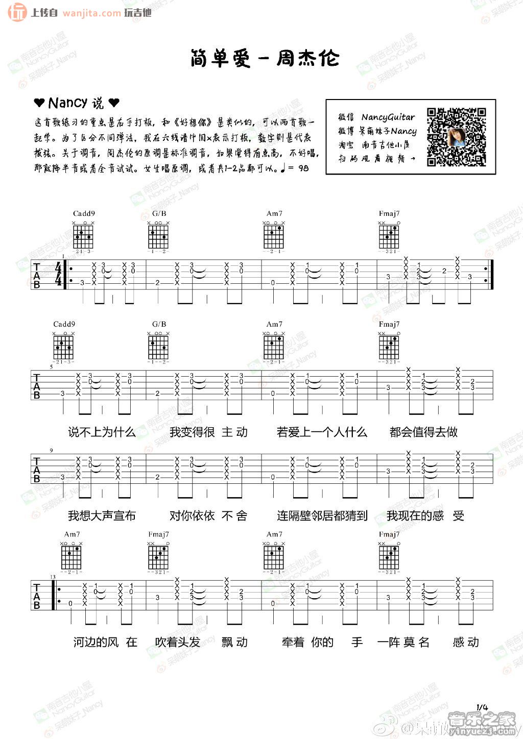 曲谱介绍: 简单爱是周杰伦出道初期一首经典的歌曲了,本吉他谱由NANCY编配提供,由玩吉他整理上传。这首歌练习的重点是右手打板,和《好想你》类似。周杰伦的原调是标准调音,如果觉得要欧典高,不好唱,那就降半音或者全音试试,女生唱原调,或者夹1-2品都可以。