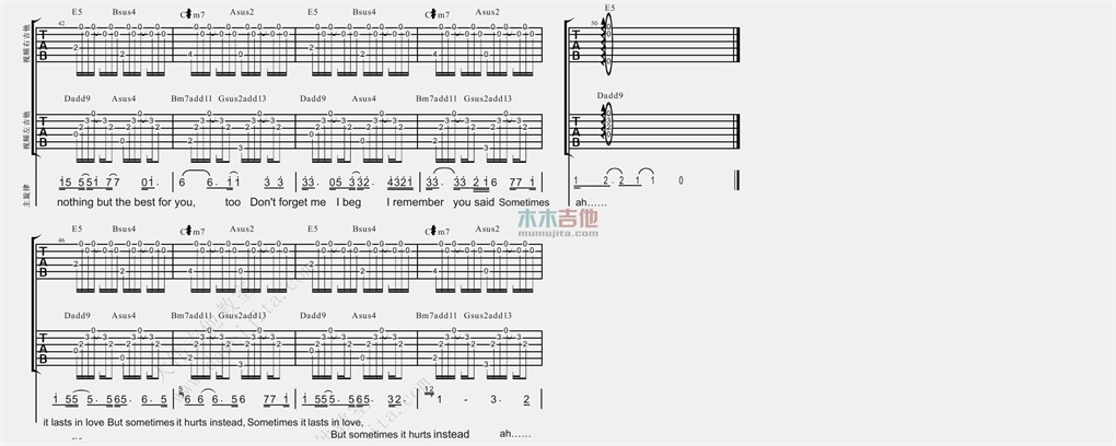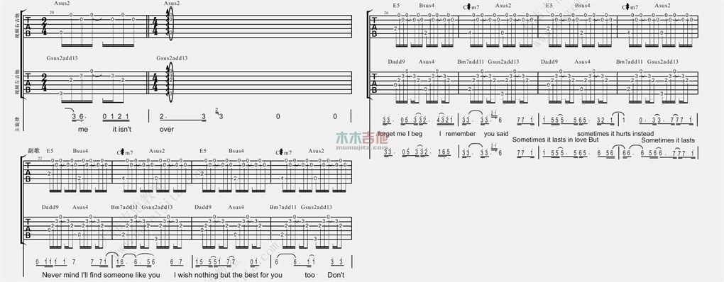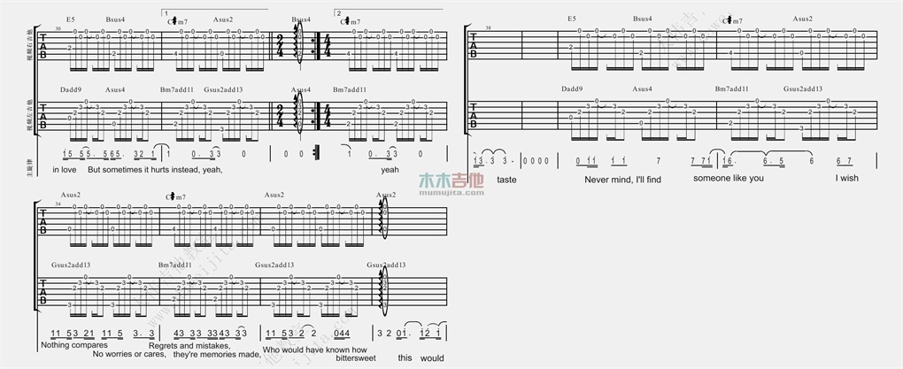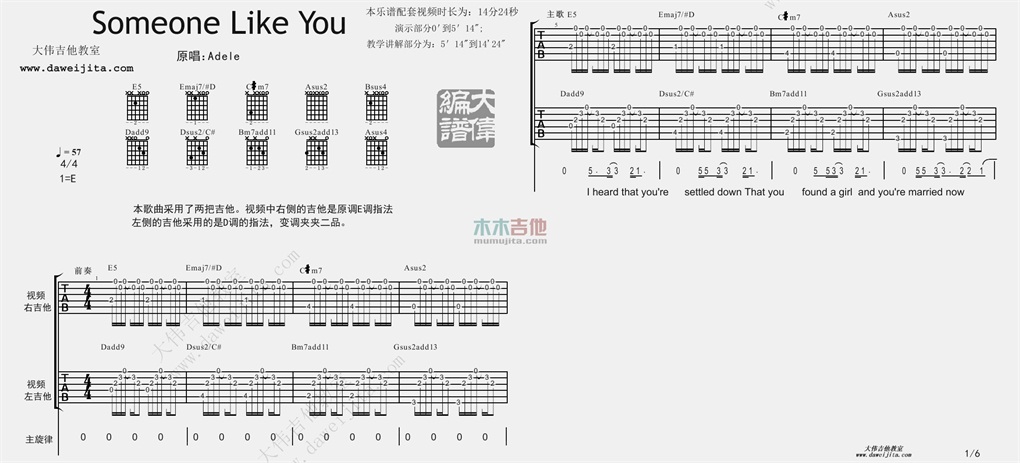 曲谱介绍: 《Someone Like You》吉他谱,总共6张高清图片谱,原调为E调,节拍4/4拍,速度每分钟57BPM,不使用变调夹,弹唱难度中级,本谱由大伟吉他编配制谱。