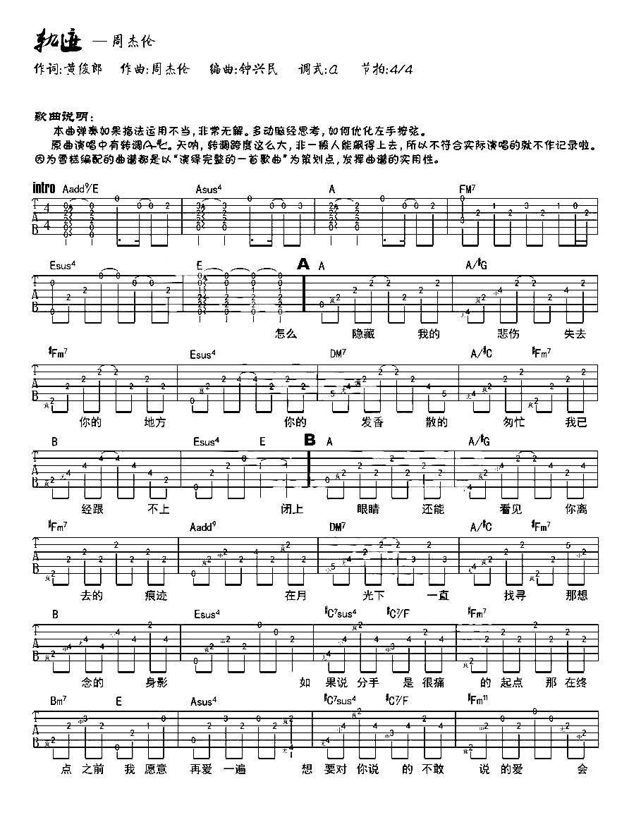 轨迹吉他谱 - 周杰伦 - A调吉他弹唱谱