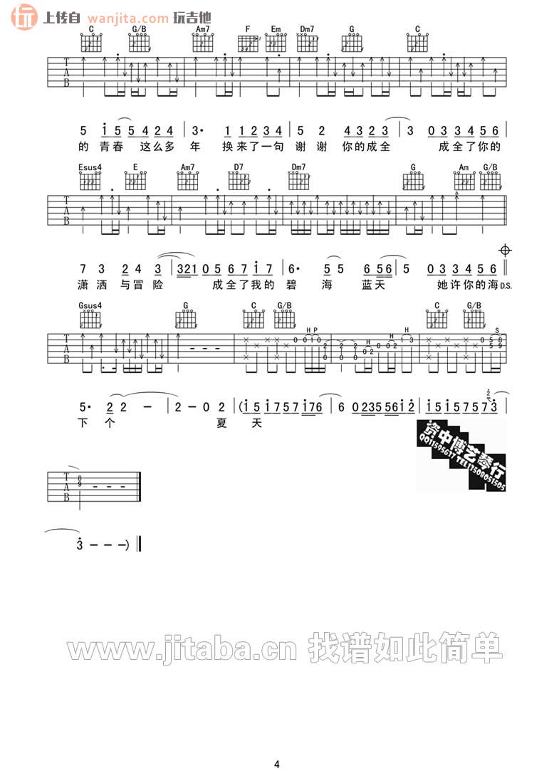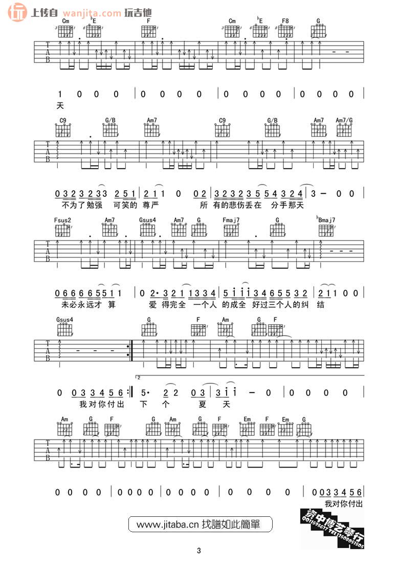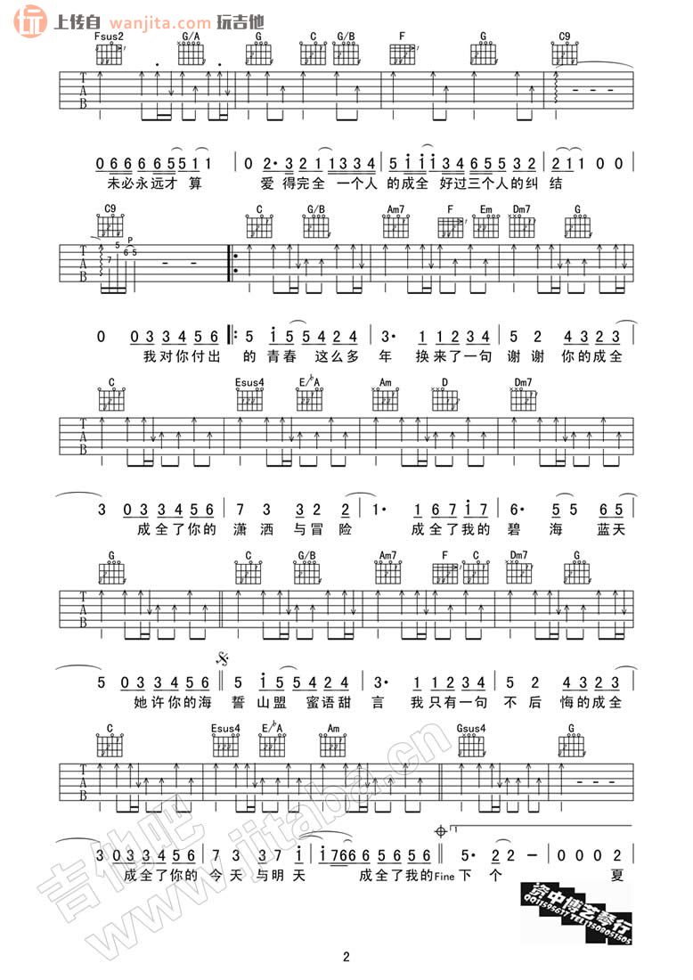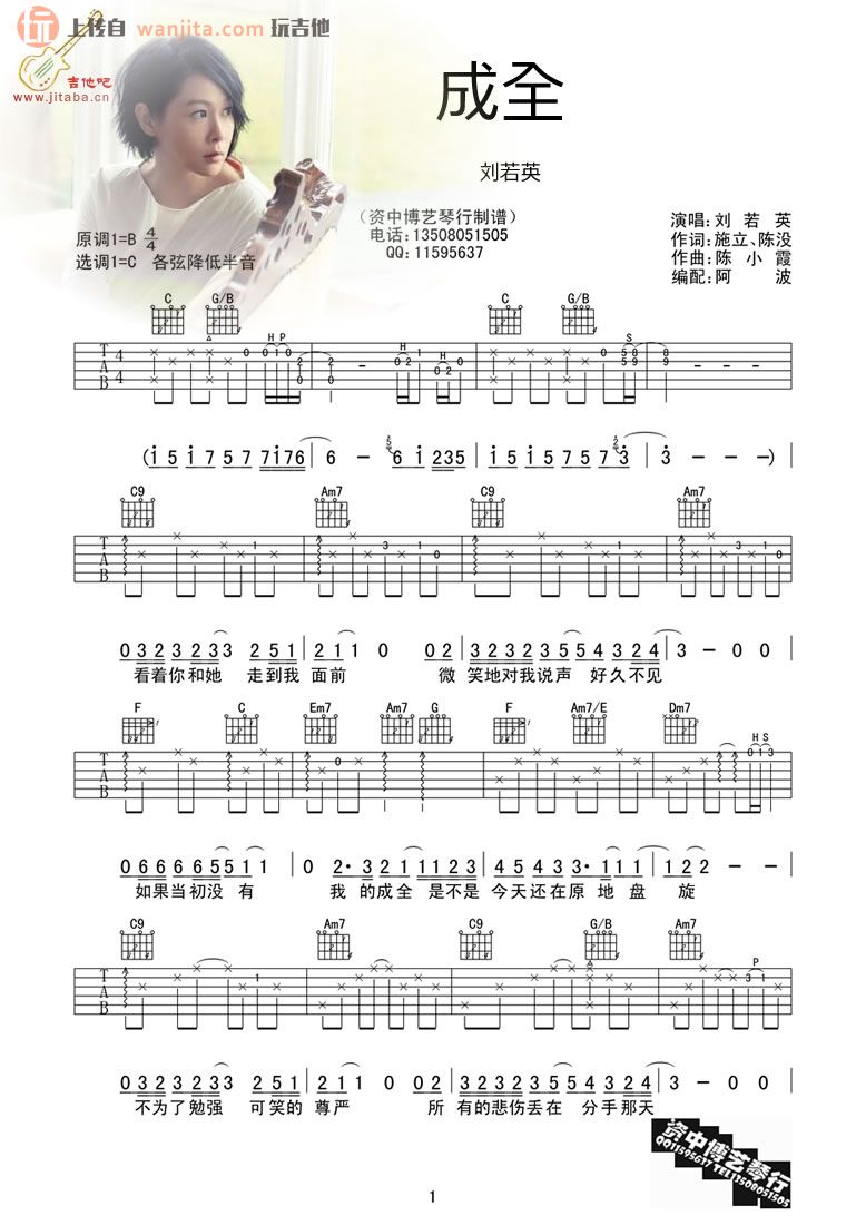 曲谱介绍: 刘若英的成全吉他谱,原调B选调C,各弦降低半音,编配阿波。成全吉他六线谱,原版简化版本,图片谱共四张分两页显示。我为你付出的青春这么多年,只换来一句谢谢你的成全,一首打动人心的好歌。