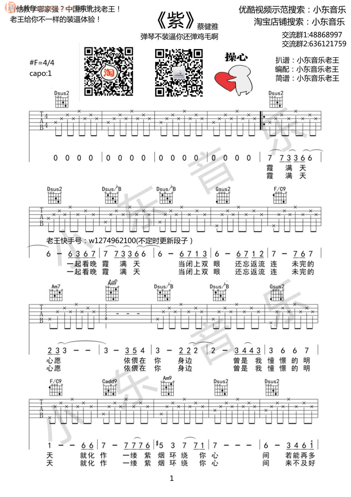 曲谱介绍: 蔡健雅《紫》吉他谱,总共3张高清图片谱,原调为升F调,节拍4/4拍,弹唱建议使用变调夹夹1品,弹唱难度中级。