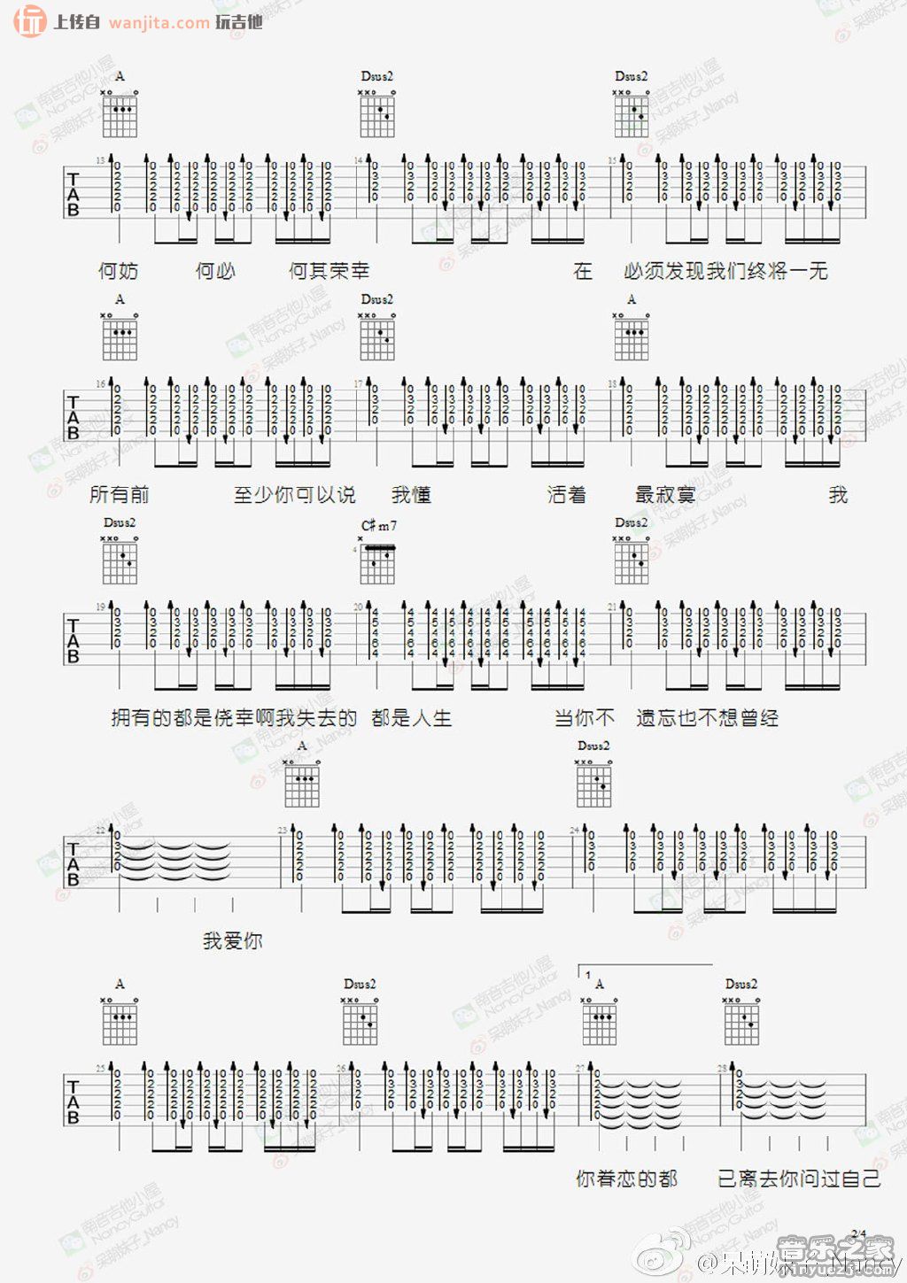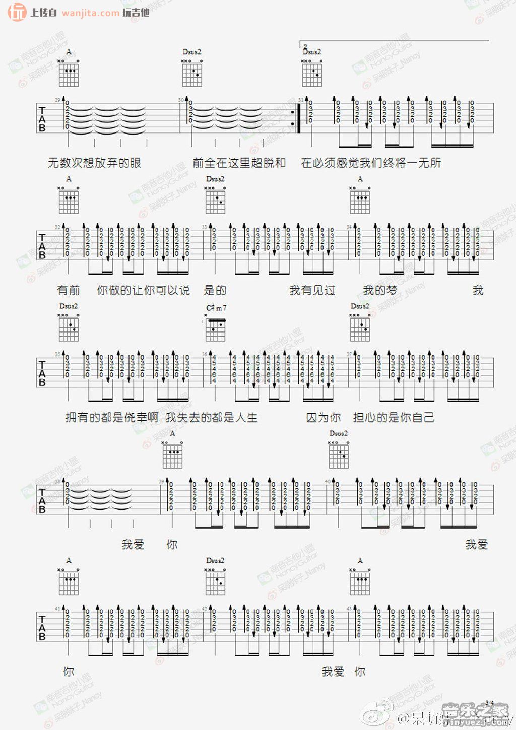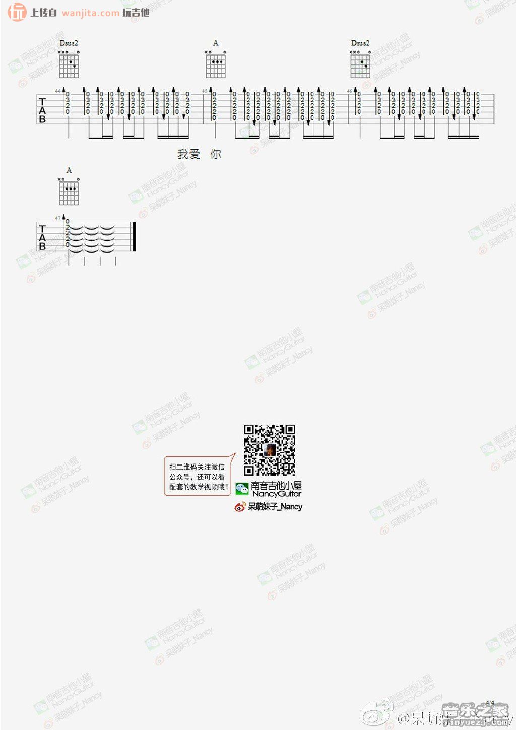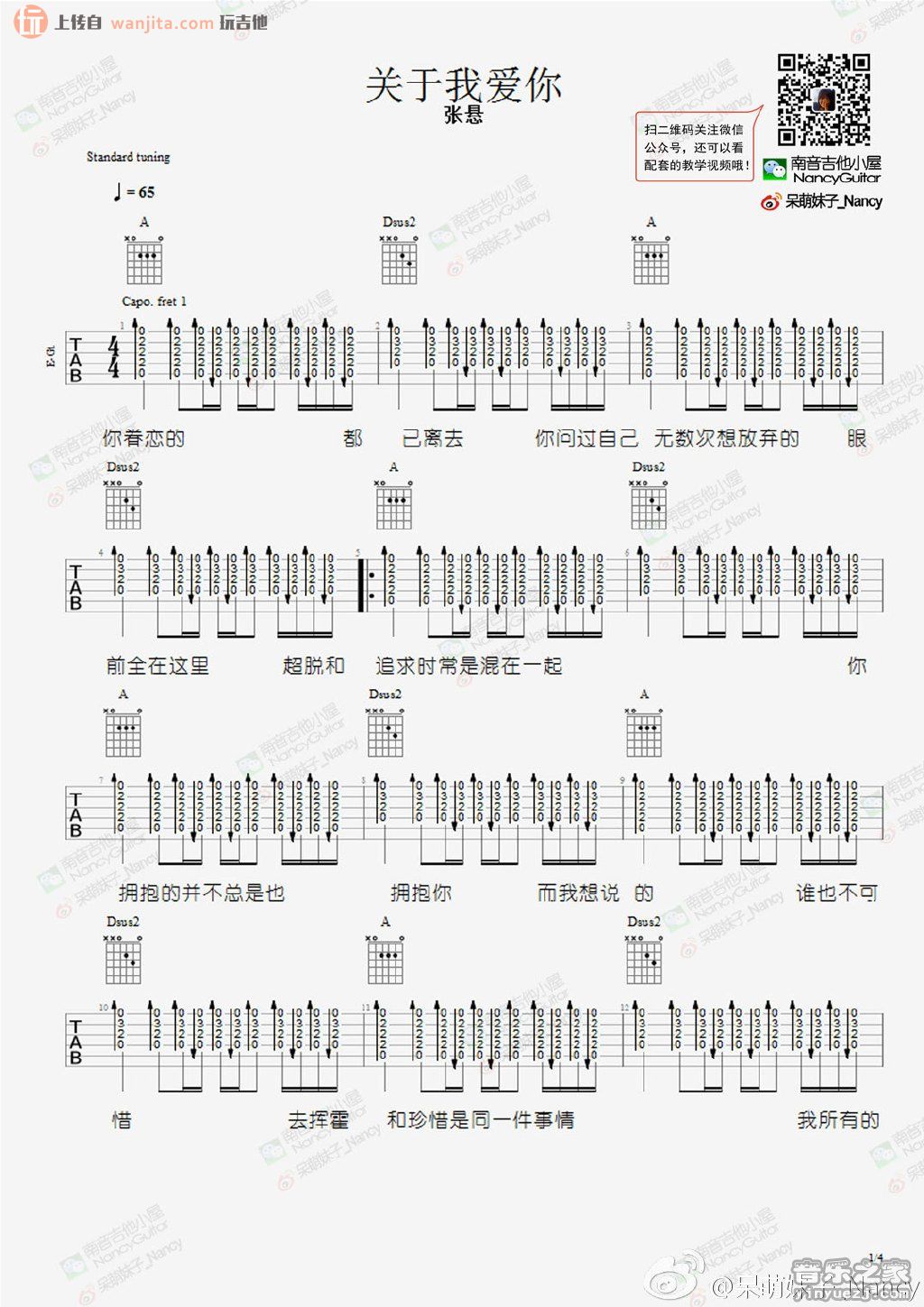 曲谱介绍: 关于我爱你吉他谱,总共4张高清图片谱,原调为A调,速度每分钟65BPM,不使用变调夹,弹唱难度初级。