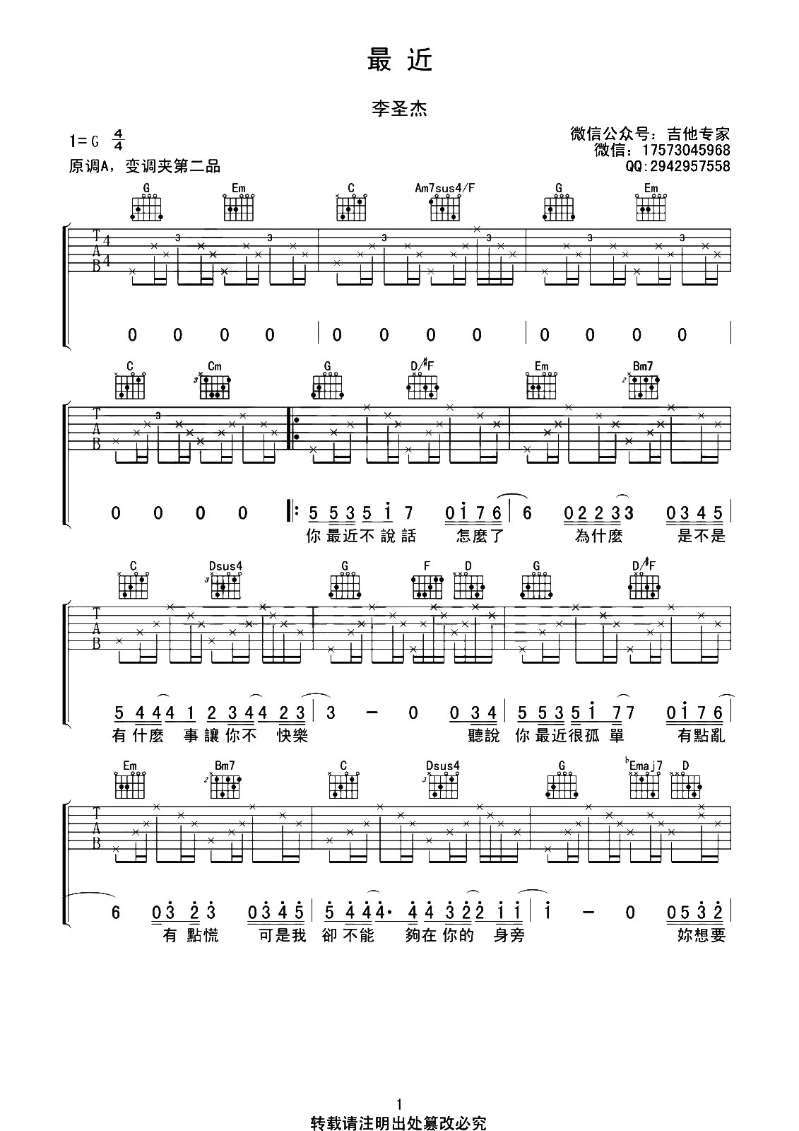 曲谱介绍: 李圣杰《最近》吉他弹唱谱,采用G调指法编配,共有3张高清图谱。