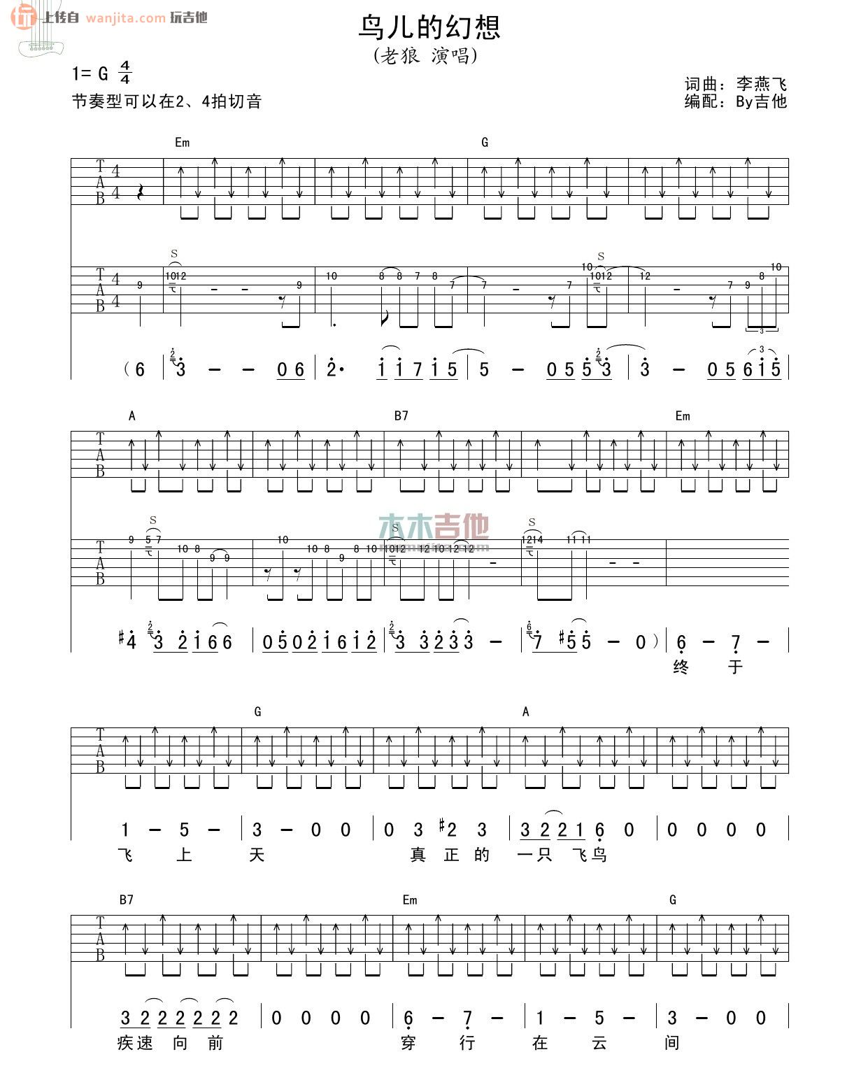 鸟儿的幻想吉他谱 - 老狼 - G调吉他弹唱谱