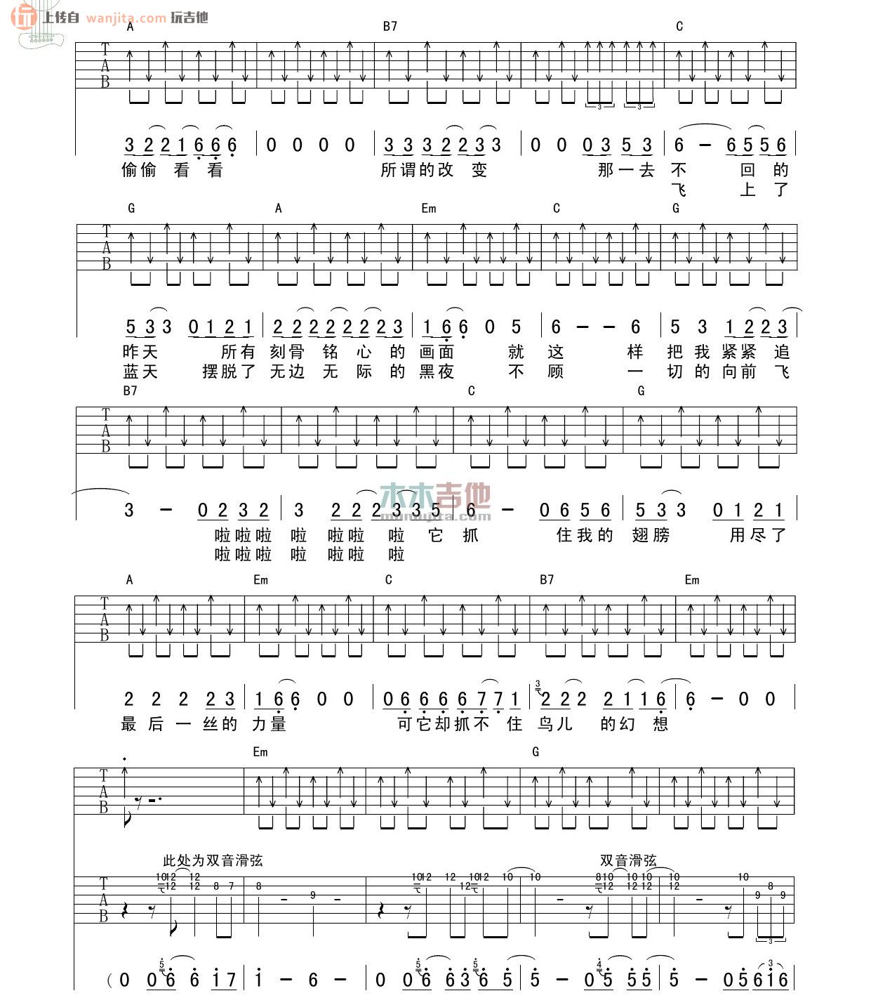 曲谱介绍: 鸟儿的幻想吉他谱,总共4张高清图片谱,原调为G调,节拍4/4,不使用变调夹,节奏型可以在2、4拍切音,弹唱难度初级。