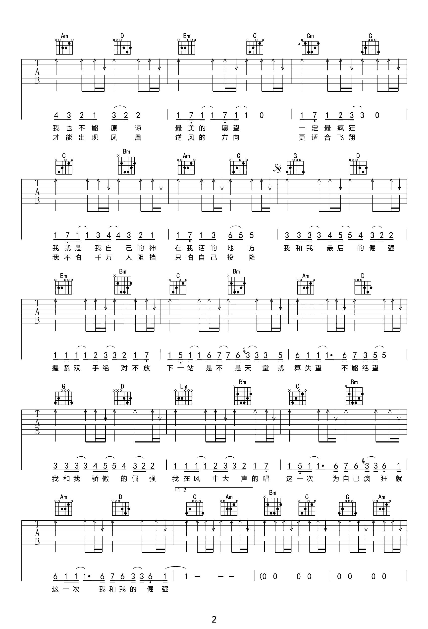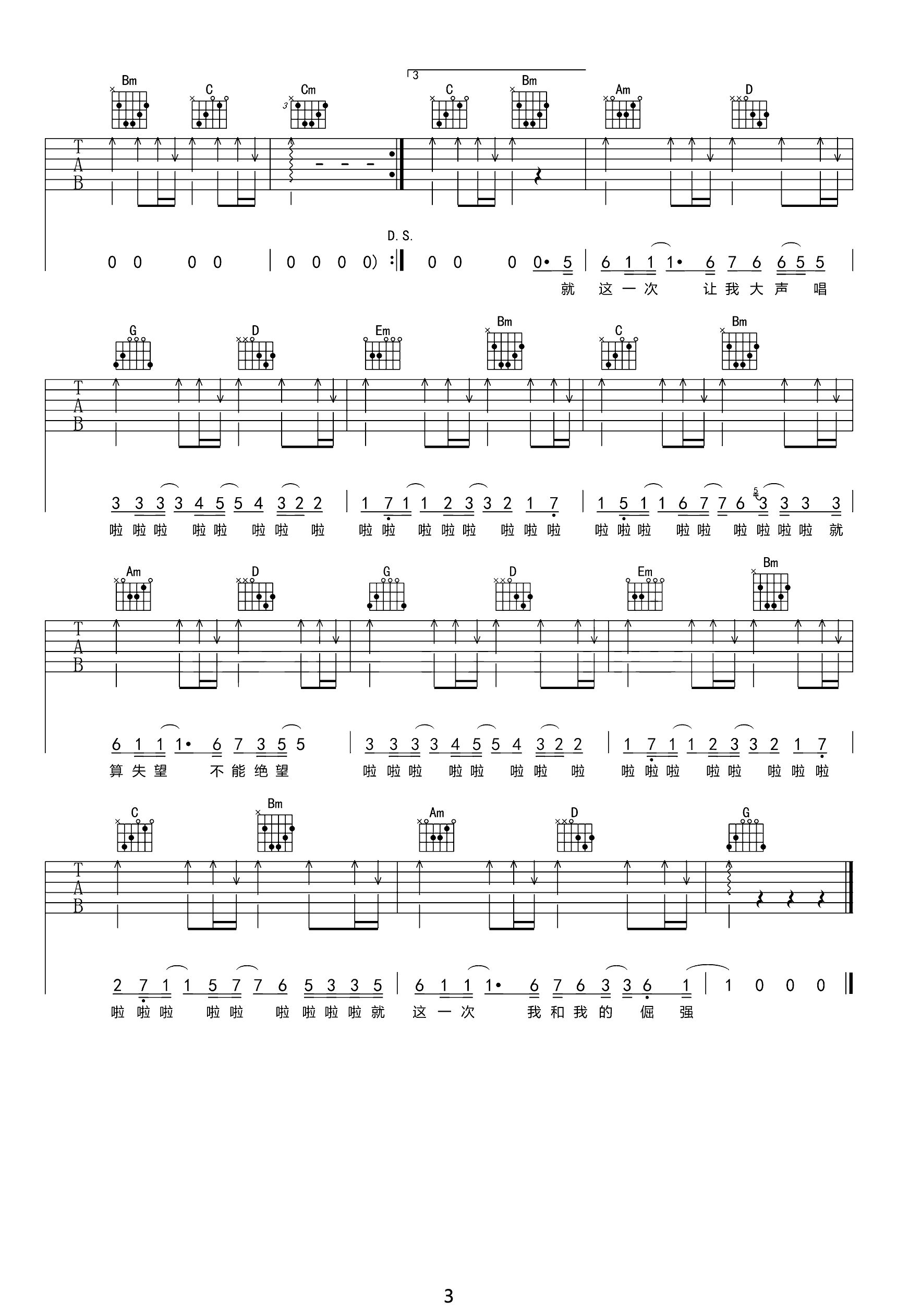 曲谱介绍: 倔强吉他弹唱谱,原调A选调G,CAPO夹二品,六线谱共三张高清图片谱例。让我们在迷茫中找到方向,在困境中成长,