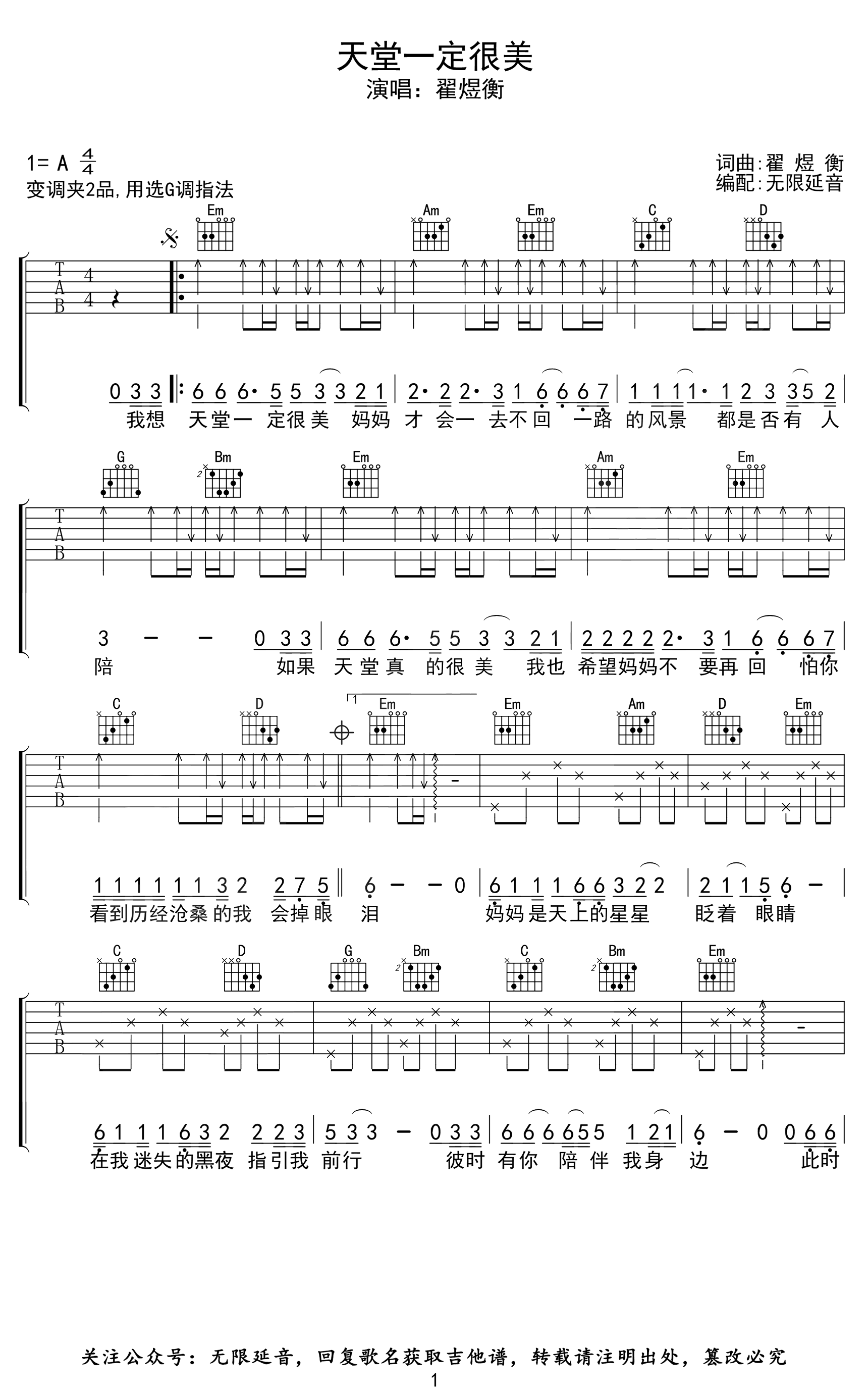 天堂一定很美吉他谱 - 翟煜衡 - G调吉他弹唱谱
