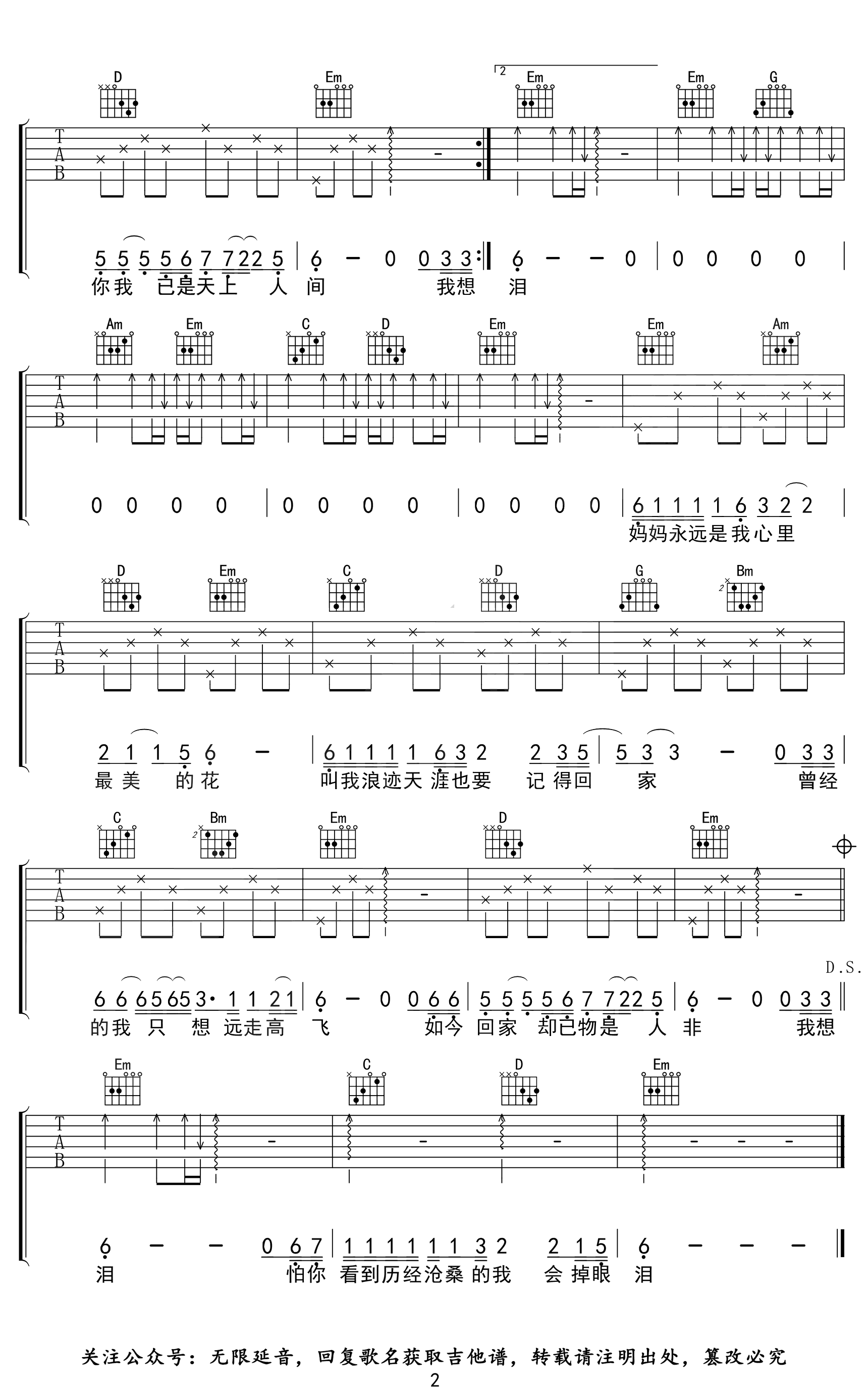曲谱介绍: 《天堂一定很美》吉他弹唱谱,原调A,变调夹二品,选用G调指法,两张高清图片六线谱。