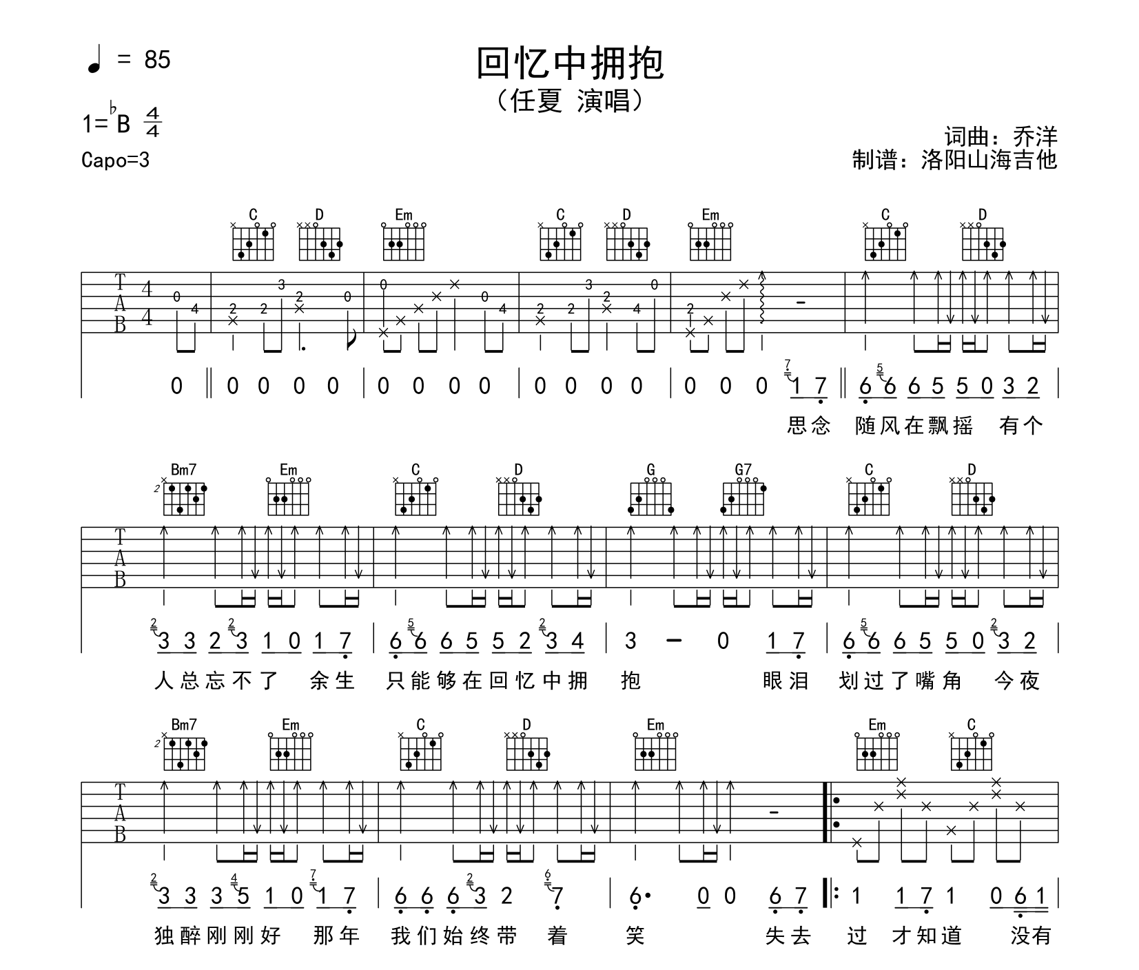 曲谱介绍: 任夏《回忆中拥抱》吉他谱,由@飞韵吉他制谱,《回忆中拥抱》吉他弹唱谱,共有两张图片谱,选用G调,原调bB,速度85BPM,节奏4/4拍,建议变调夹夹3品弹唱,含前奏按原版编配,难度初级简单。