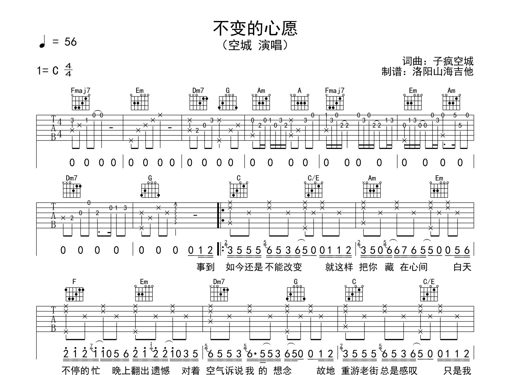 曲谱介绍: 空城《不变的心愿》吉他谱,由@飞韵吉他制谱,《不变的心愿》吉他弹唱谱,共有两张图片谱,选用C调指法,不用变调夹弹唱,节奏4/4拍,速度56BPM,按原版编配,难度初级简单。