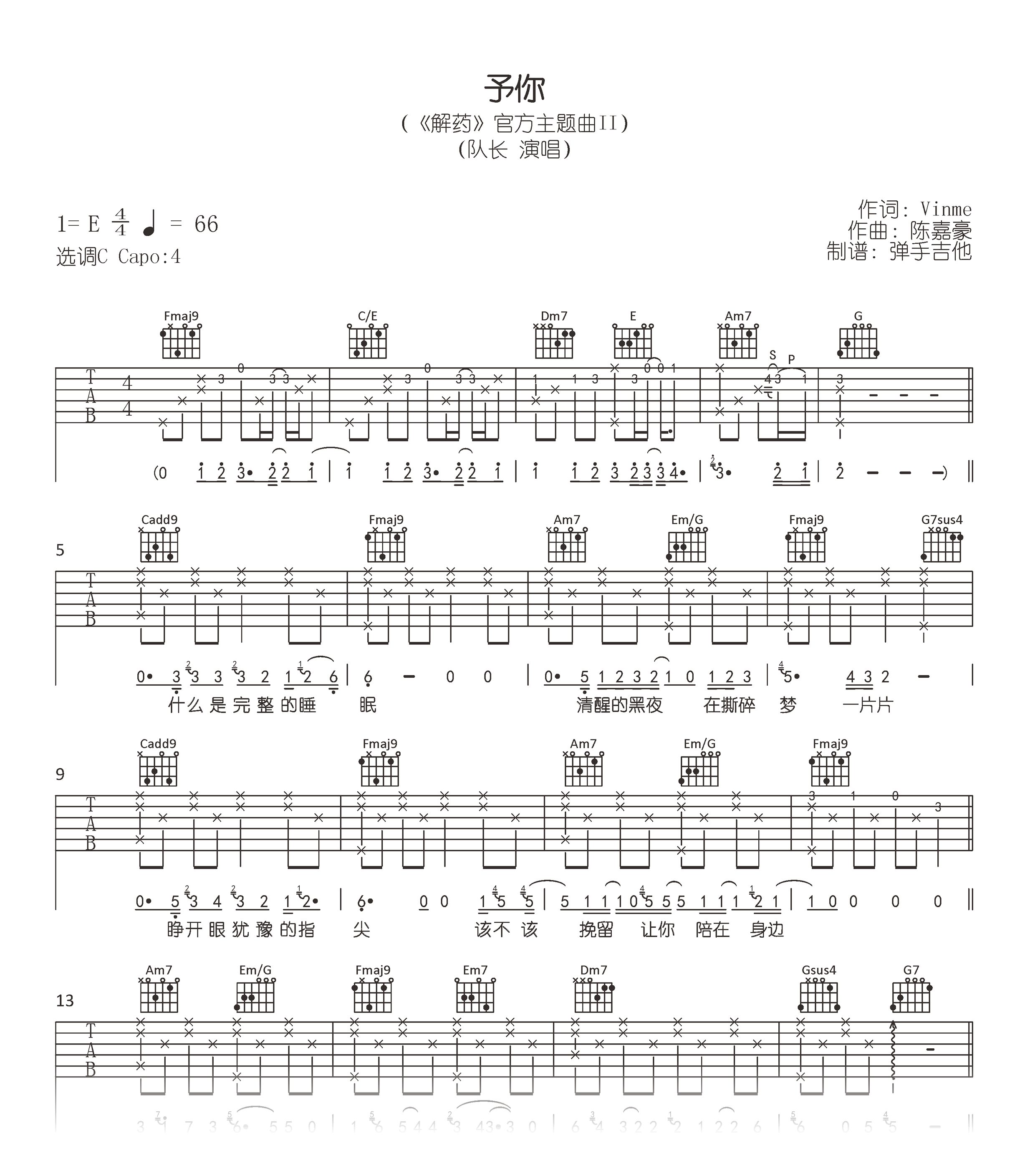 曲谱介绍: 予你吉他谱,队长演唱巫哲小说《解药》官方主题曲,予你吉他弹唱谱,原调E选调C,Capo夹四品,完整高清图片谱共三张六线谱例。吉他帮品质推荐。