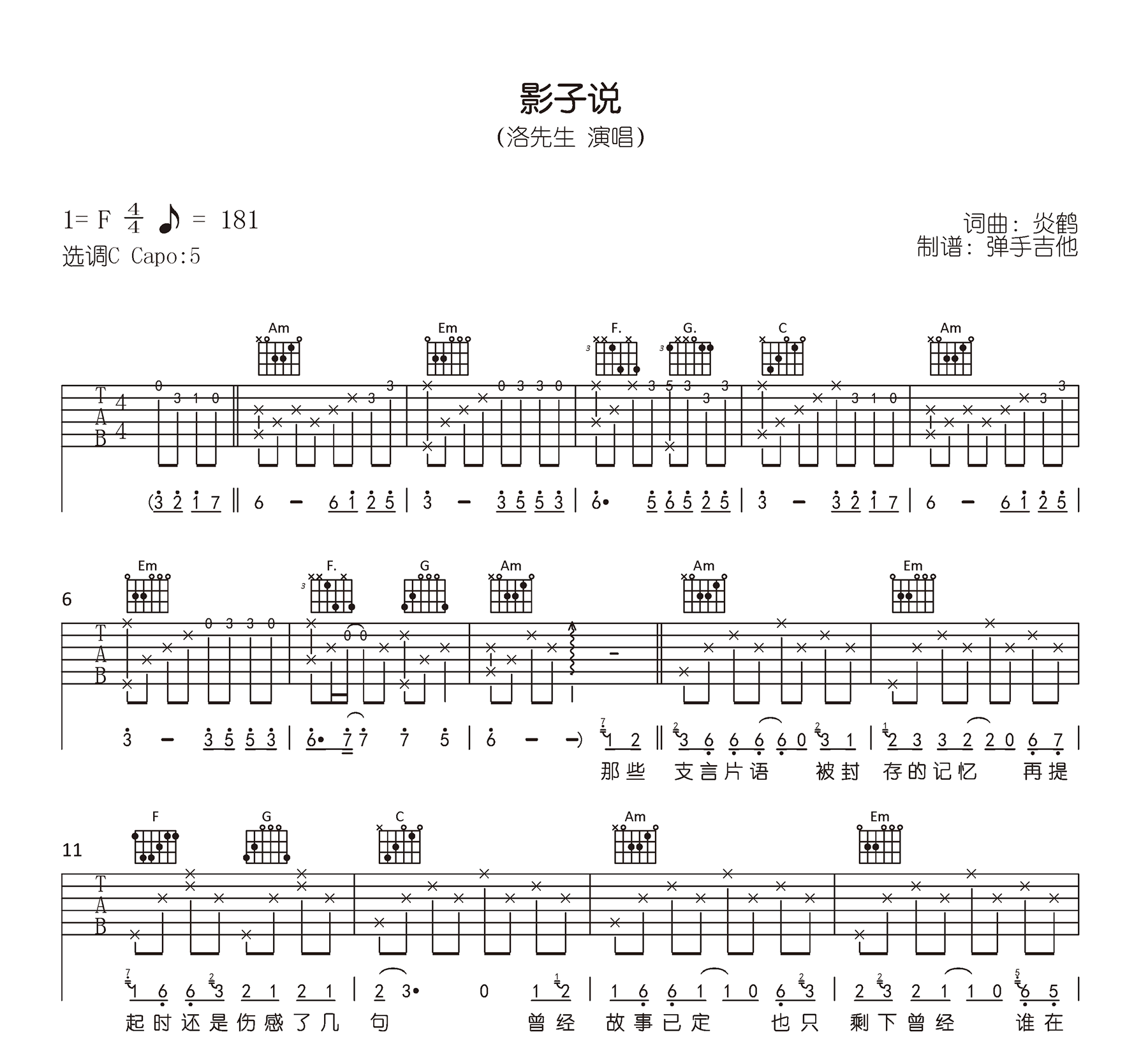 曲谱介绍: 洛先生一首唱给痴情人的歌,影子说吉他谱,原调F选调C,Capo夹五品,《影子说》吉他弹唱谱,完整版共三张高清图片六线谱。吉他帮上传推荐。