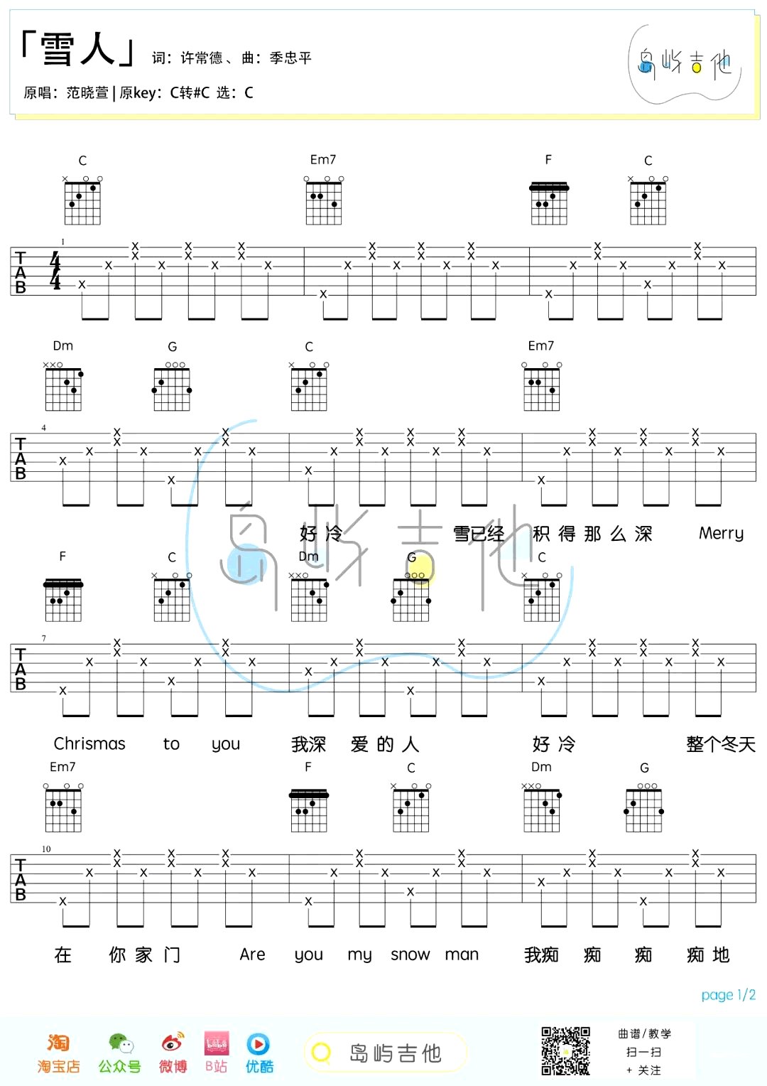 雪人吉他谱 - 范晓萱 - C调吉他弹唱谱