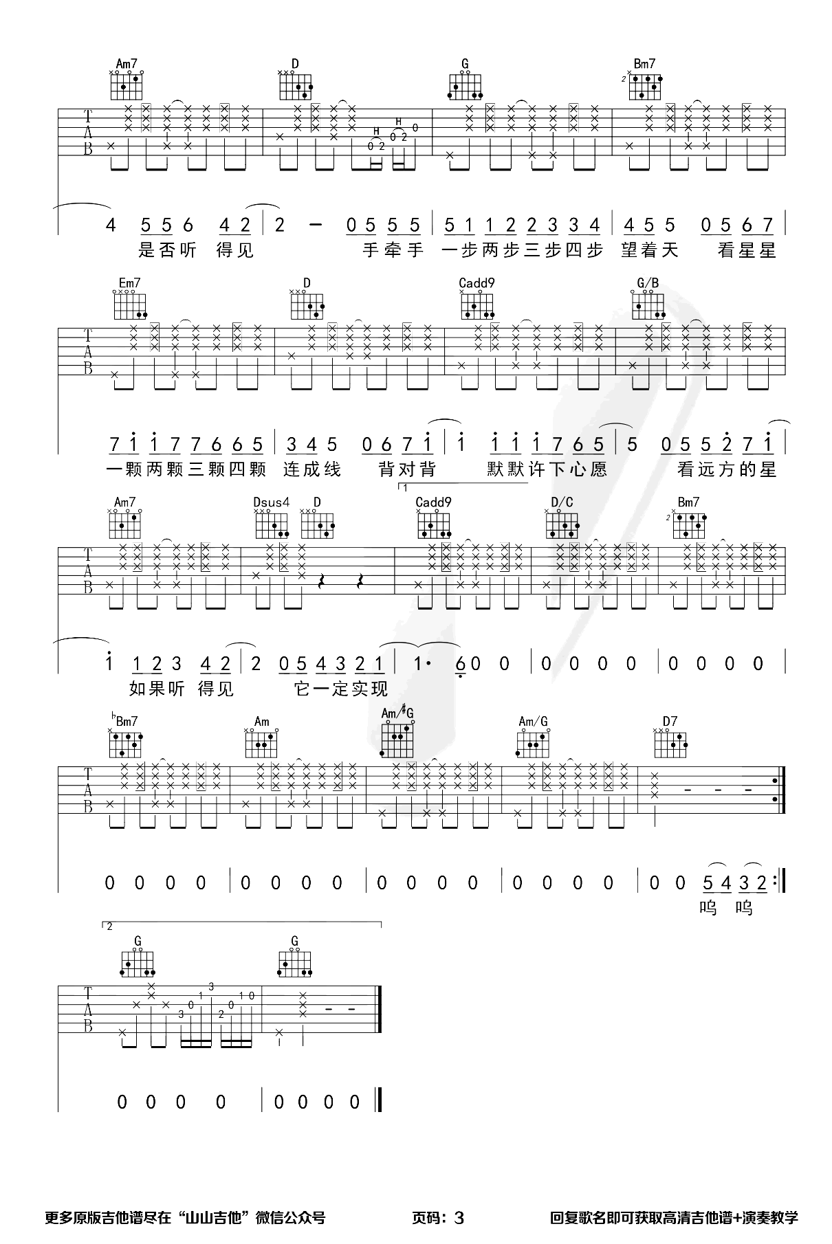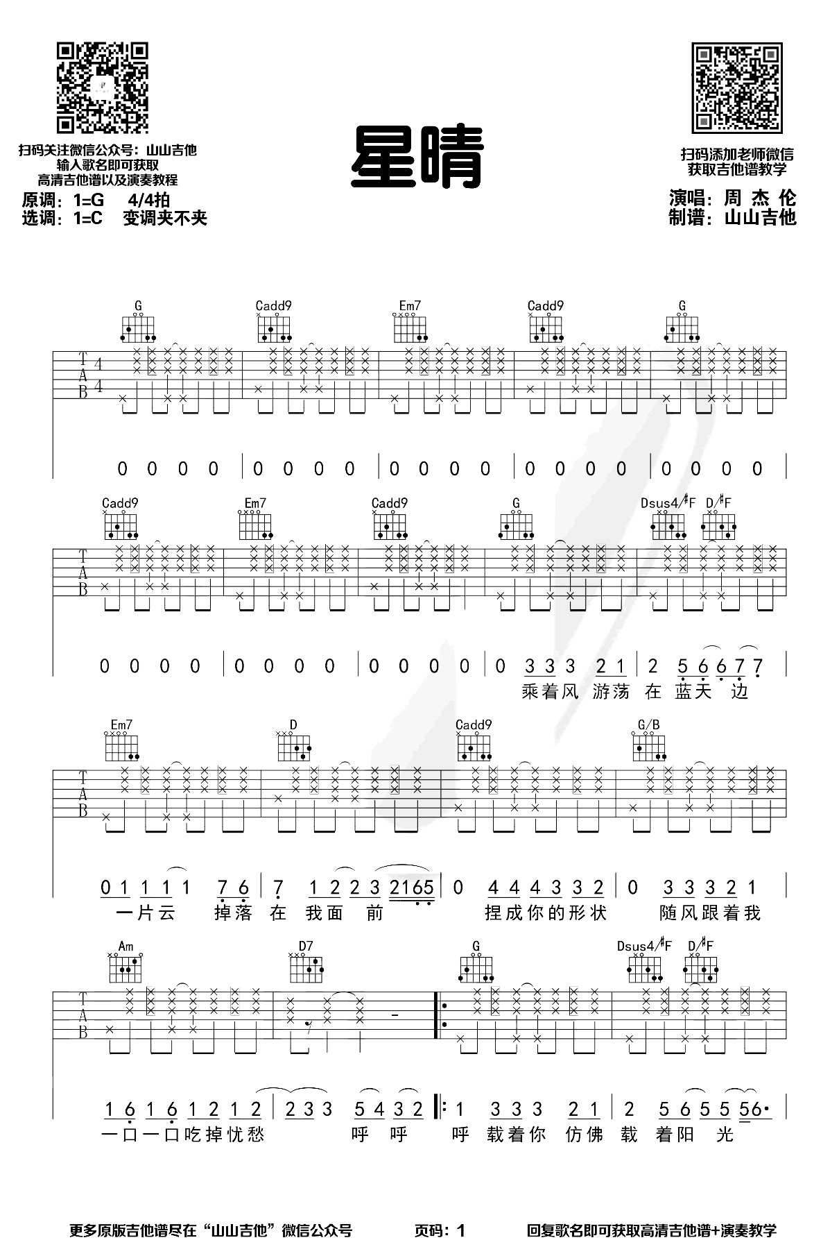曲谱介绍: 星晴吉他谱,周杰伦的一首经典歌曲,原调G选调C,男生变调夹不夹,建议女生可以夹三品左右。随谱附上《星晴》吉他弹唱演示和教学,琴友们跟随山山老师的示范讲解学习。