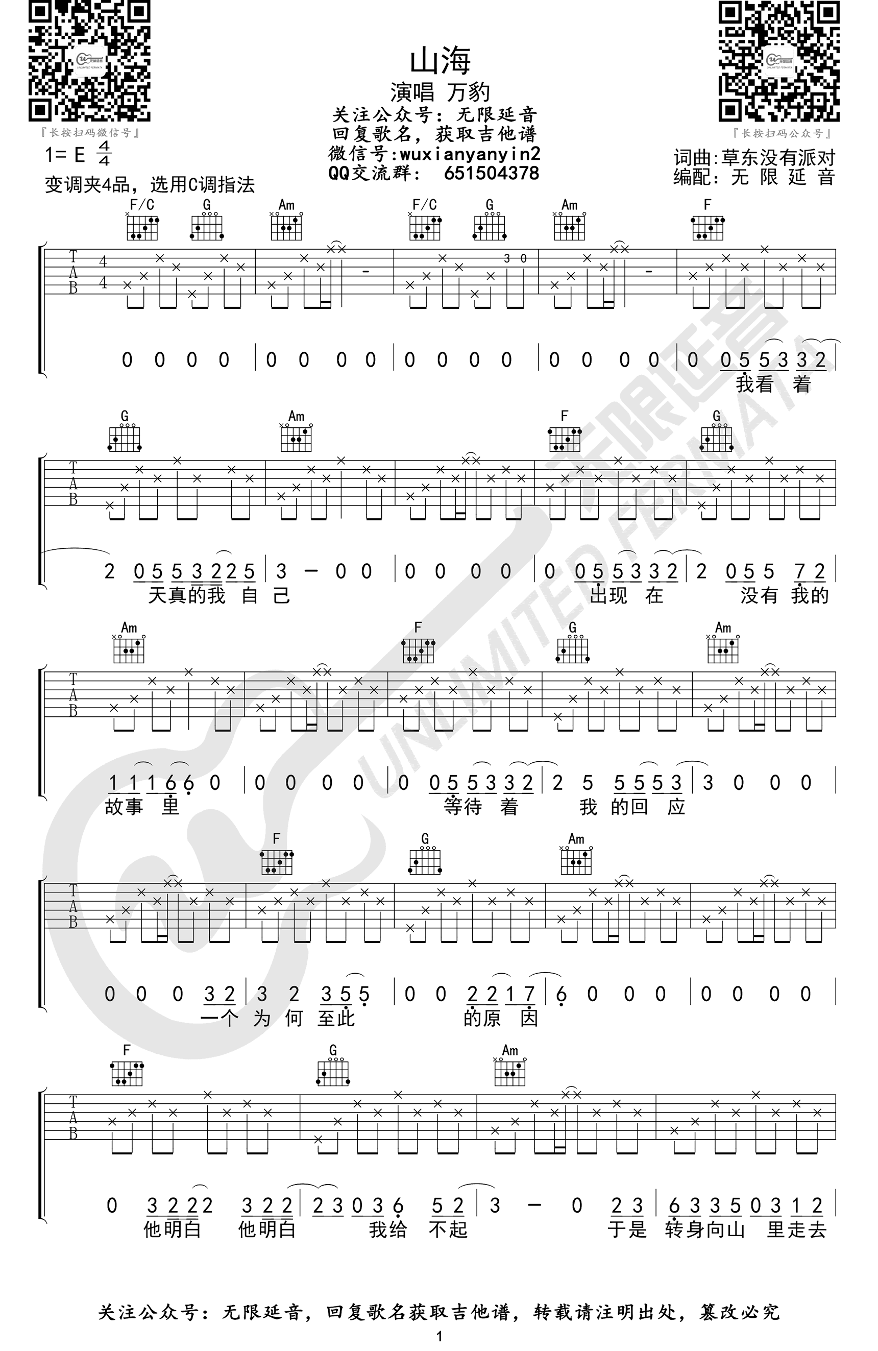 曲谱介绍: 万豹演唱的一首歌曲,草东没有派对原唱,山海吉他谱,原调E,选用C调指法,变调夹夹四品,《山海》吉他弹唱六线谱,三张高清图片谱例。