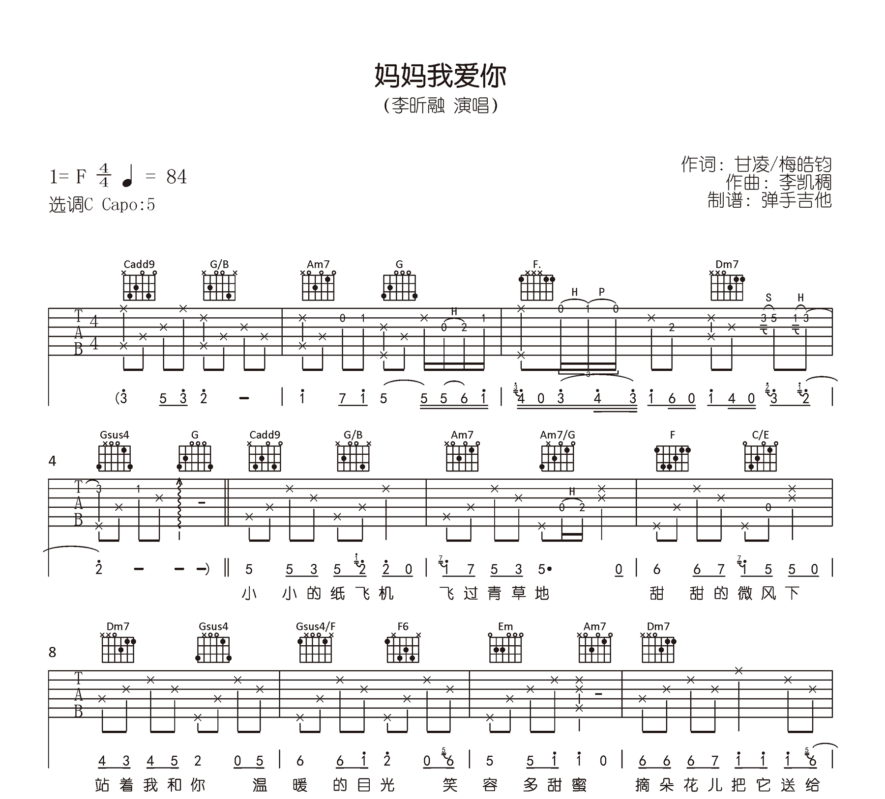 曲谱介绍: 李昕融演唱的一首献给母亲的歌,妈妈我爱你吉他谱,原调F,选调C,CAPO夹五品,《妈妈我爱你》吉他弹唱谱,完整编配共两张高清图片六线谱。