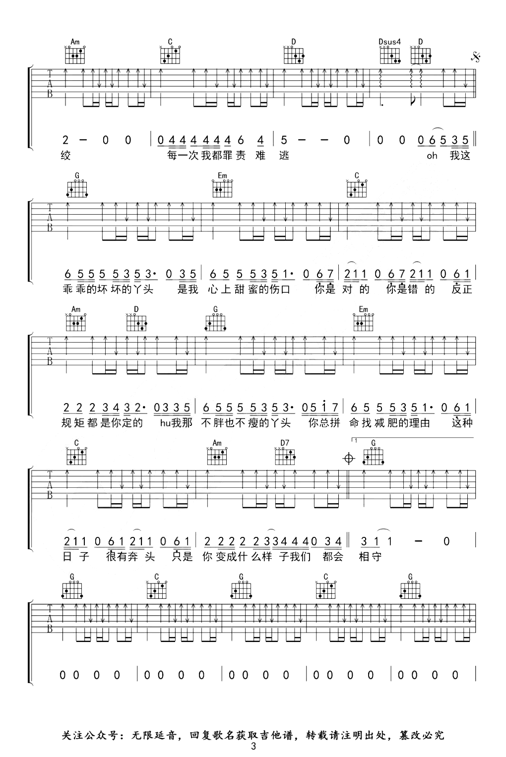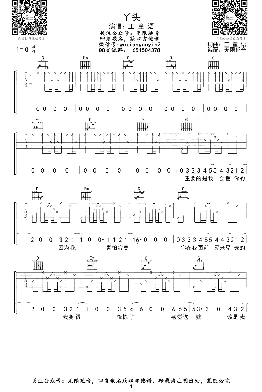 曲谱介绍: 丫头吉他谱,王童语词曲创作演唱的一首民谣歌曲,《丫头》吉他弹唱谱,G调和弦指法,完整编配共四张图片六线谱。吉他帮网站更新上传。