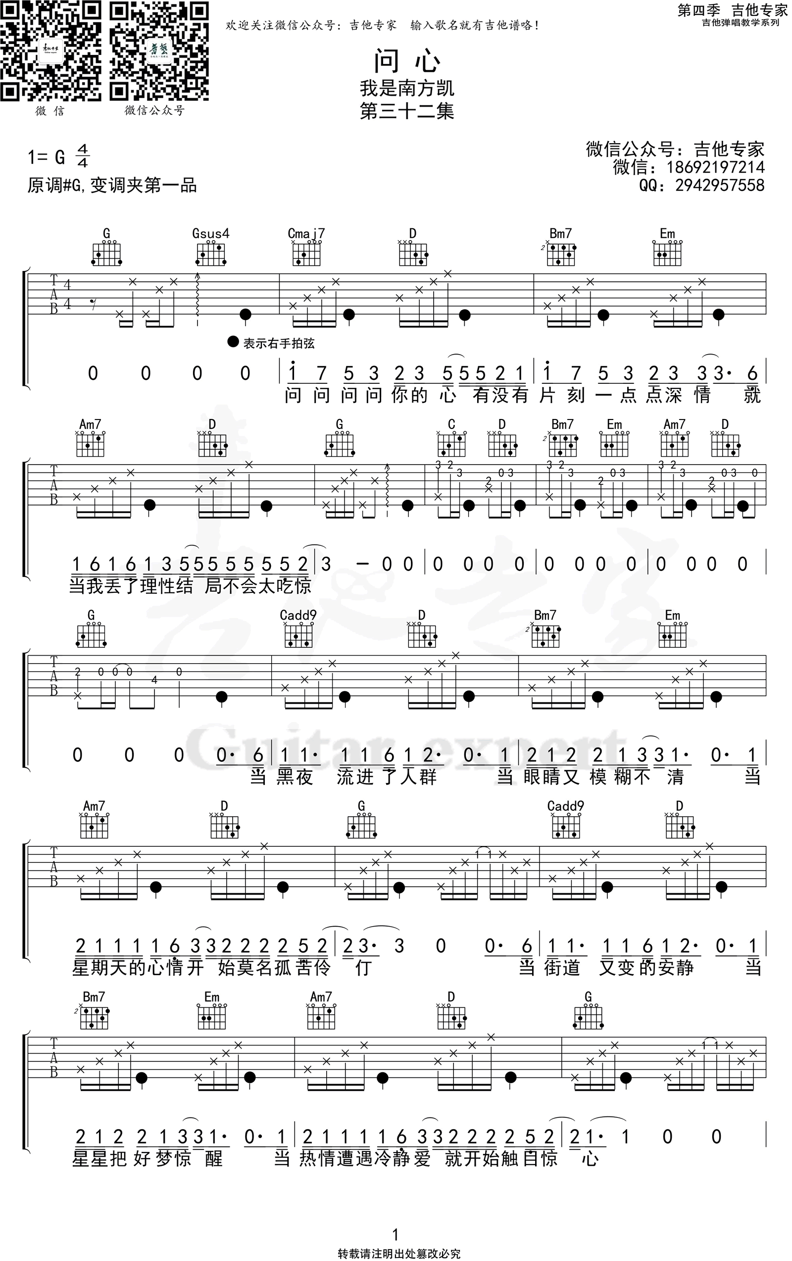 曲谱介绍: 问心吉他谱,就是南方凯的一首网络热门歌曲,《问心》吉他六线谱,原调升G,变调夹夹一品,选用G调指法编配,高清图片谱共三张弹唱谱例。吉他帮整理更新。