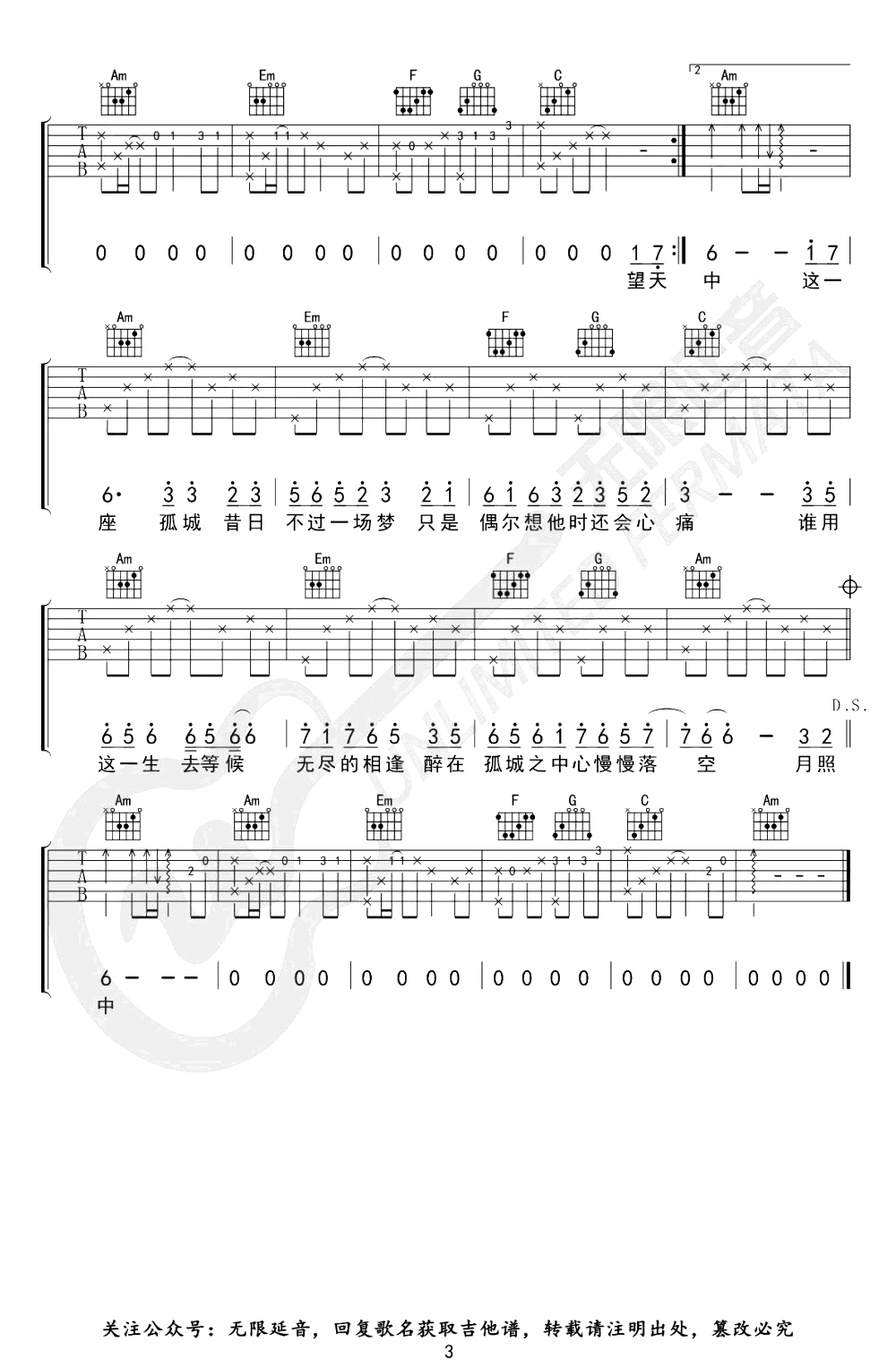 曲谱介绍: 洛先生的一首网络热门歌曲,温柔绵延而略带感伤的古风旋律。孤城吉他谱,选用C调和弦编配。《孤城》吉他弹唱六线谱,三张图片谱例。