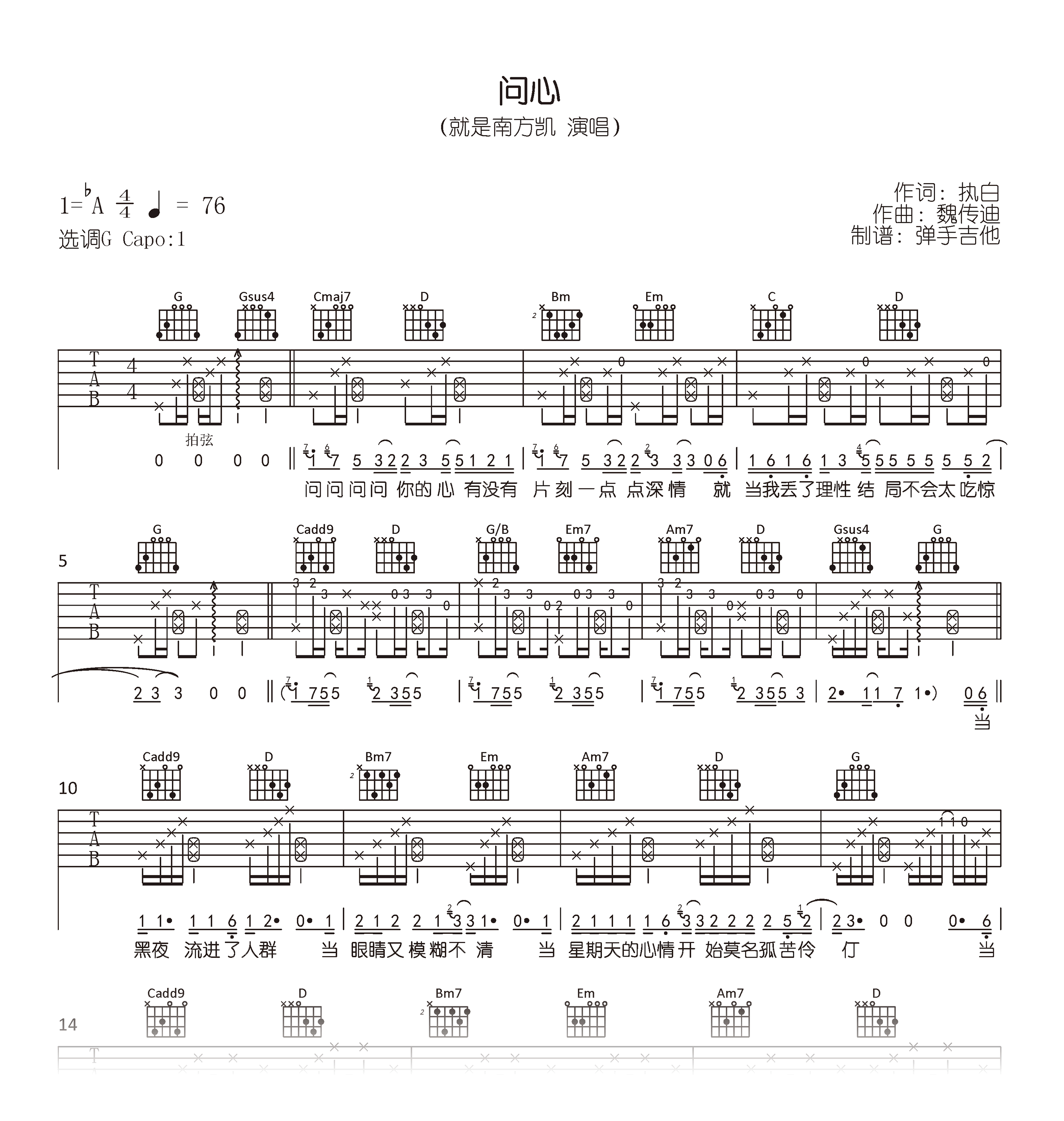 曲谱介绍: 就是南方凯演唱,问心吉他谱,原调降A选调G,CAPO夹一品。《问心》吉他弹唱谱,完整高清图片谱共三张,吉他帮推荐分享。