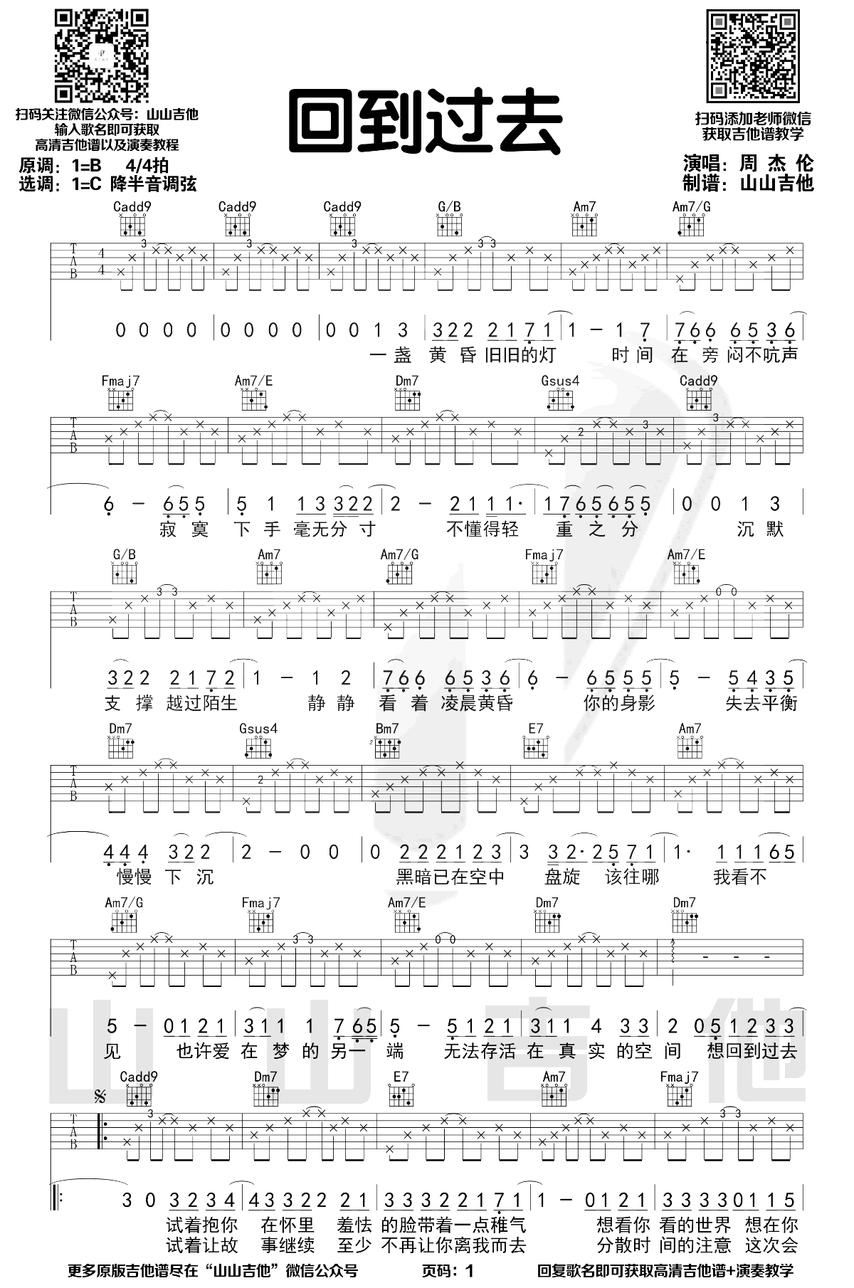曲谱介绍: 回到过去吉他谱,周杰伦的一首经典老歌,原调B选调C,降半音调弦,两张图片六线谱。附上配套《回到过去》吉他弹唱教学视频,喜欢这首歌曲的同学们跟随山山老师的讲解示范认真练习。