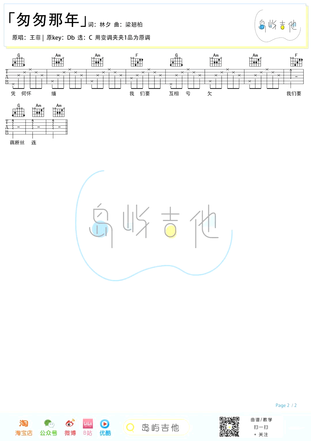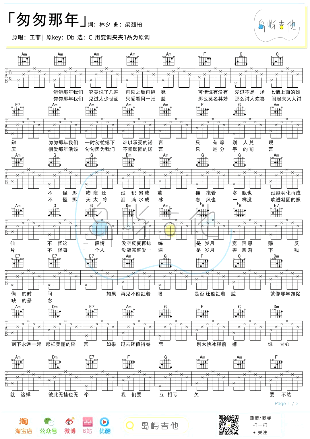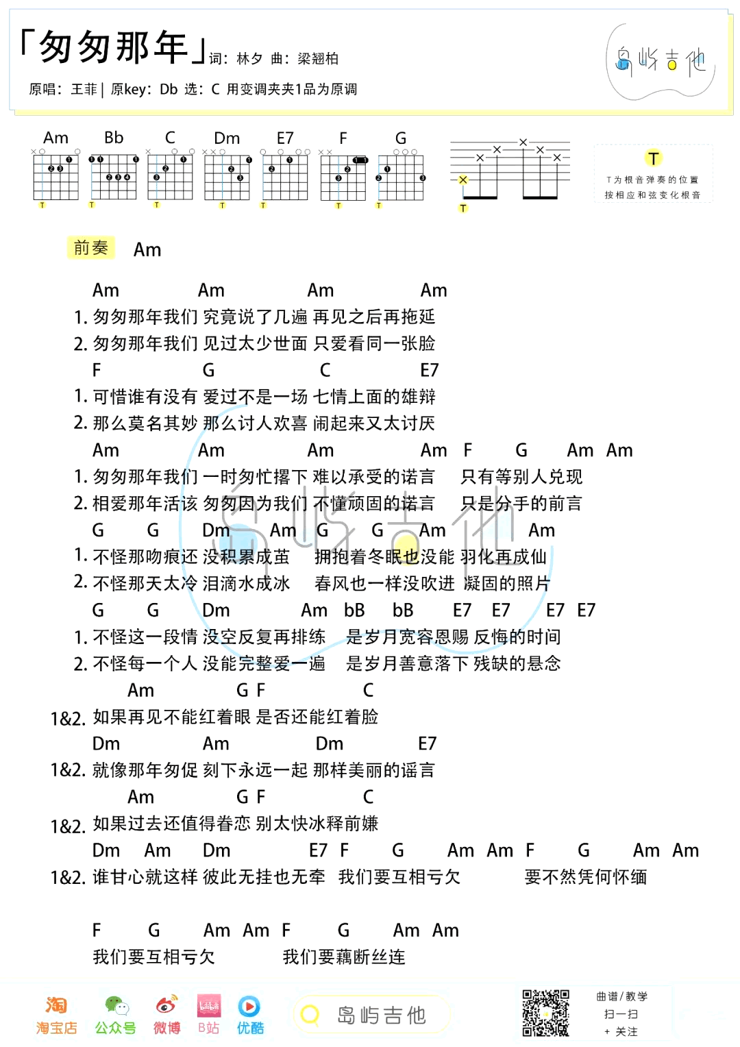 曲谱介绍: 王菲的一首经典同名电影主题曲,匆匆那年吉他谱,原调Db,选调C,变调夹夹一品为原调。《匆匆那年》吉他弹唱谱,三张图片谱例(六线谱+和弦谱),吉他帮网站更新上传。