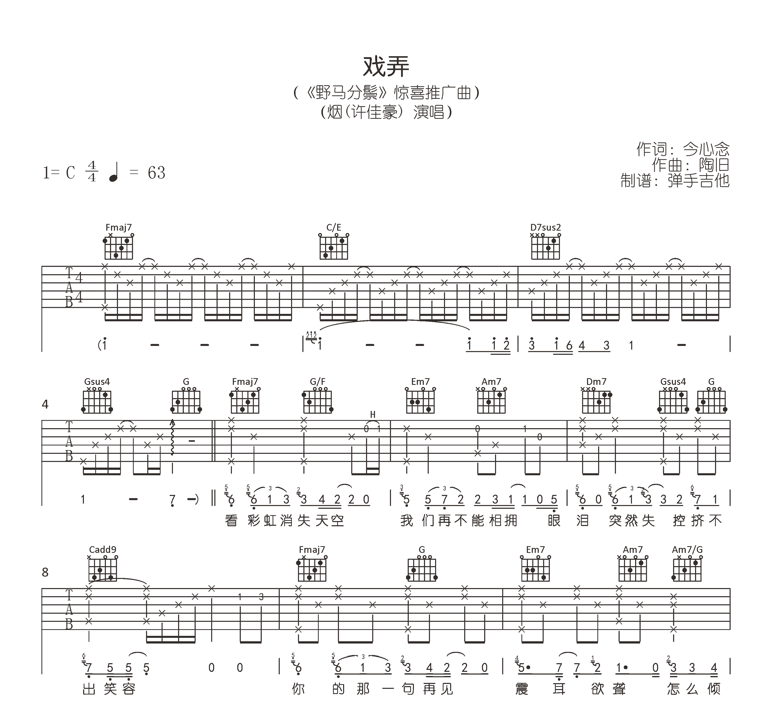 曲谱介绍: 戏弄吉他谱,烟(许佳豪)演唱,电影《野马分鬃》推广曲,《戏弄》吉他弹唱谱,选用C调和弦指法,完整编配共三张高清图片六线谱。