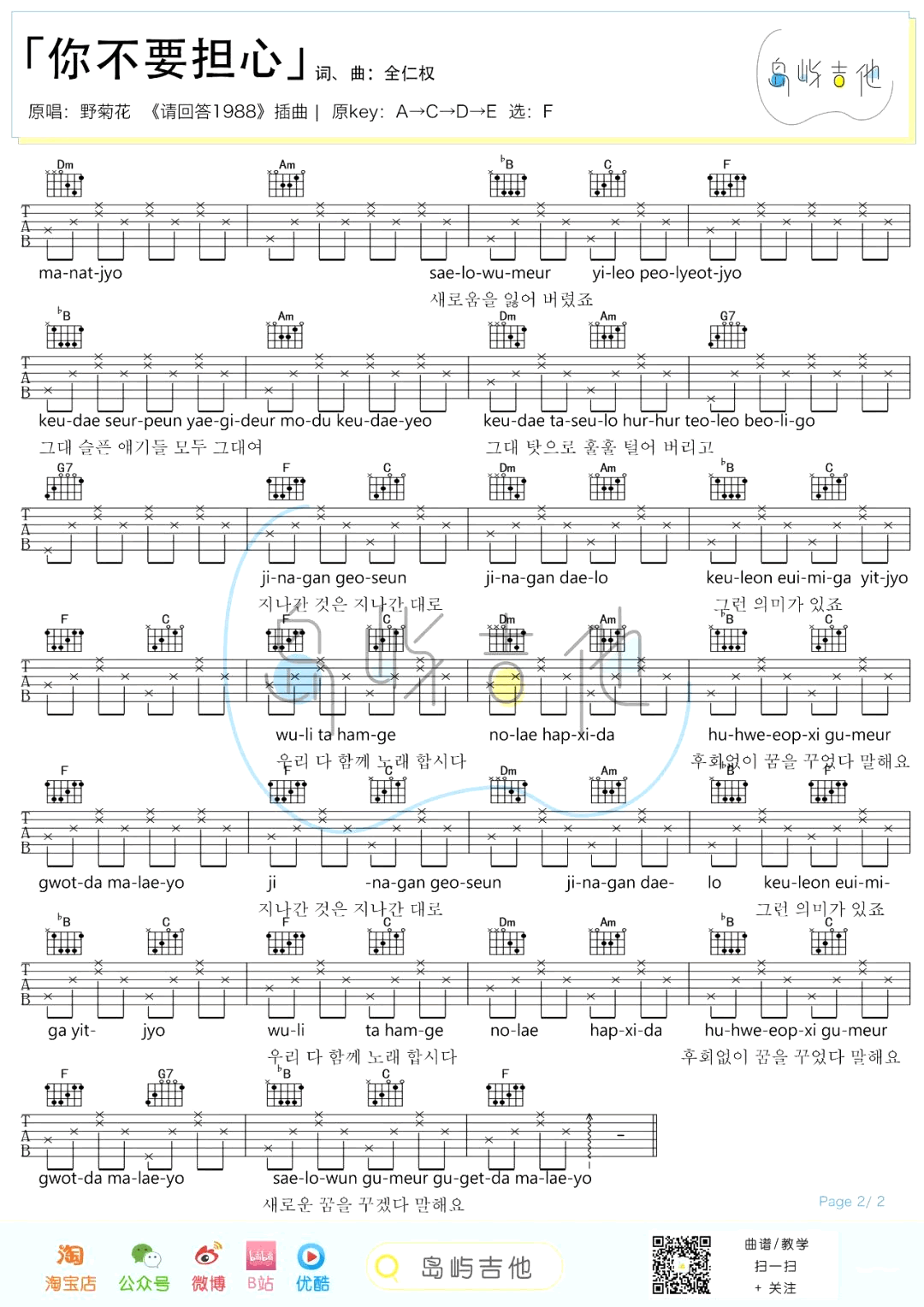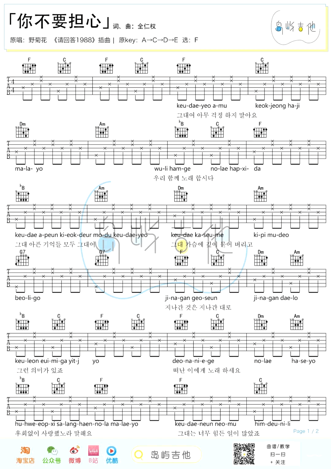 曲谱介绍: 韩剧《请回答1988》吉他弹唱谱,共有2张高清图谱,免翻页排版设计。