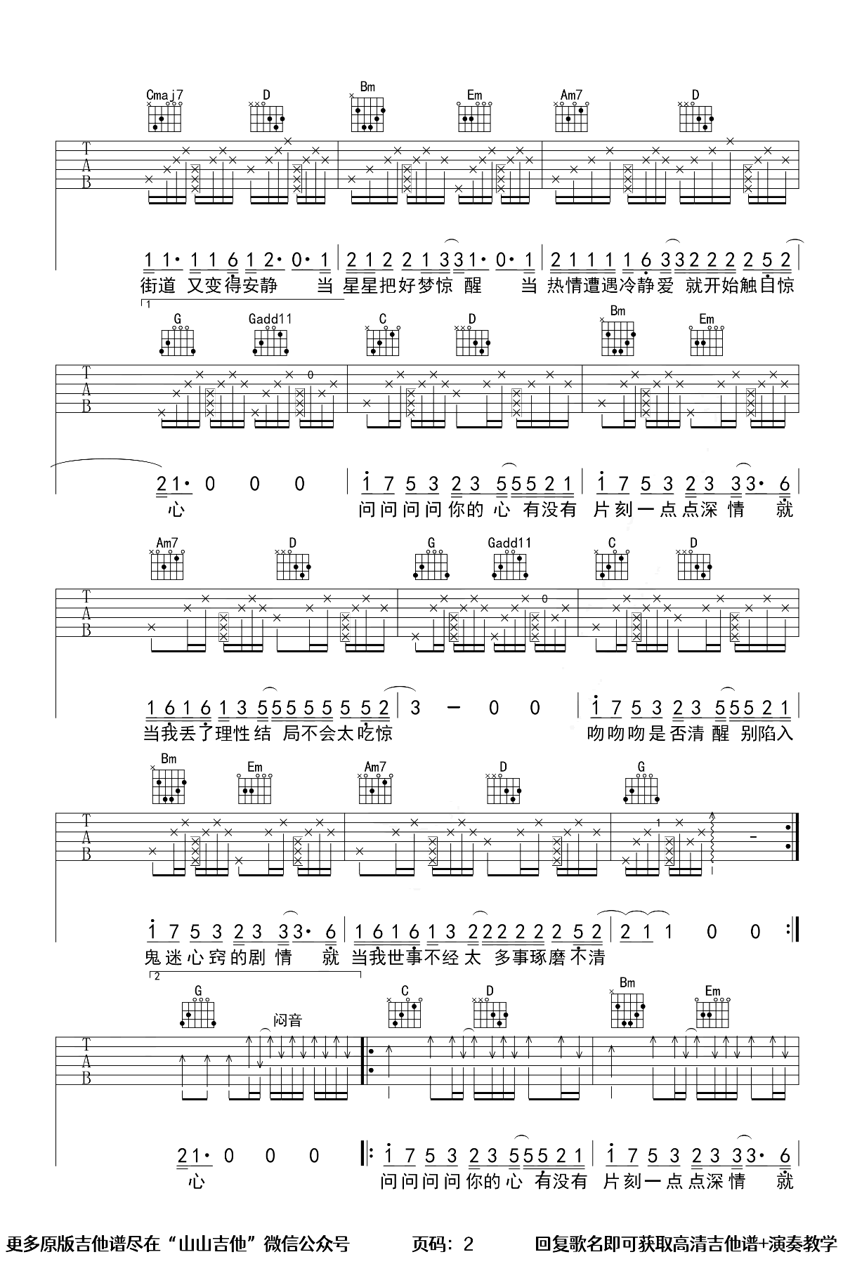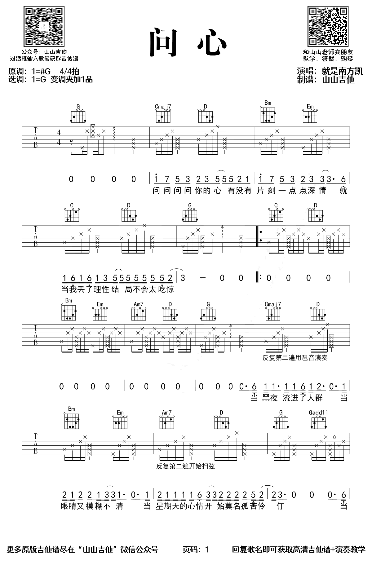 曲谱介绍: 问心吉他谱,就是南方凯的一首热门网络歌曲,原调升G选调G,变调夹加一品,原版编配共三张图片六线谱。附上《问心》吉他弹唱演示视频,琴友们参照山山老师的示范练习起来。