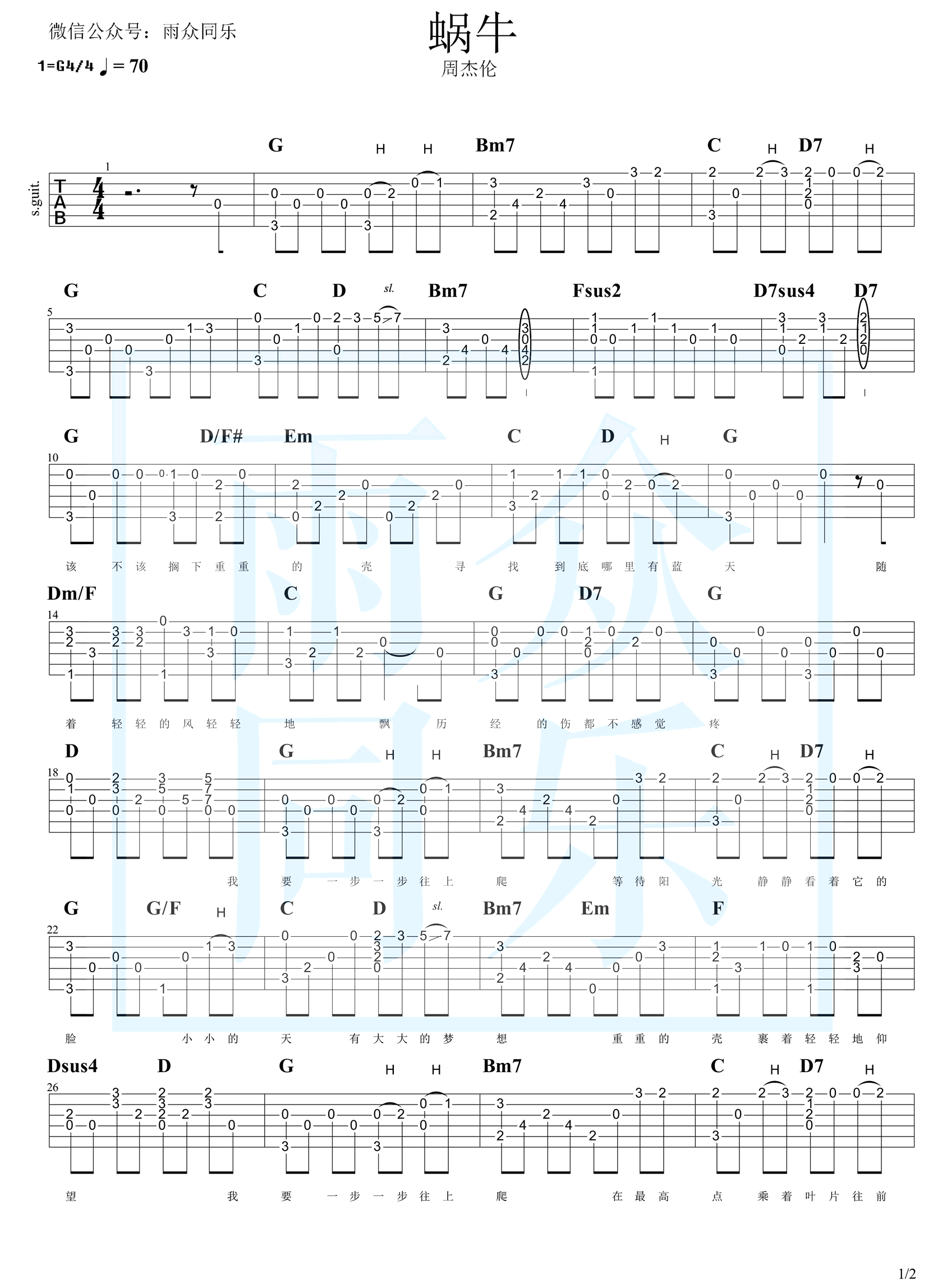 曲谱介绍: 周杰伦一首积极向上的励志歌曲,蜗牛吉他指弹谱,很简单的独奏,适合入门学习用,《蜗牛》吉他独奏谱,两张图片谱例。