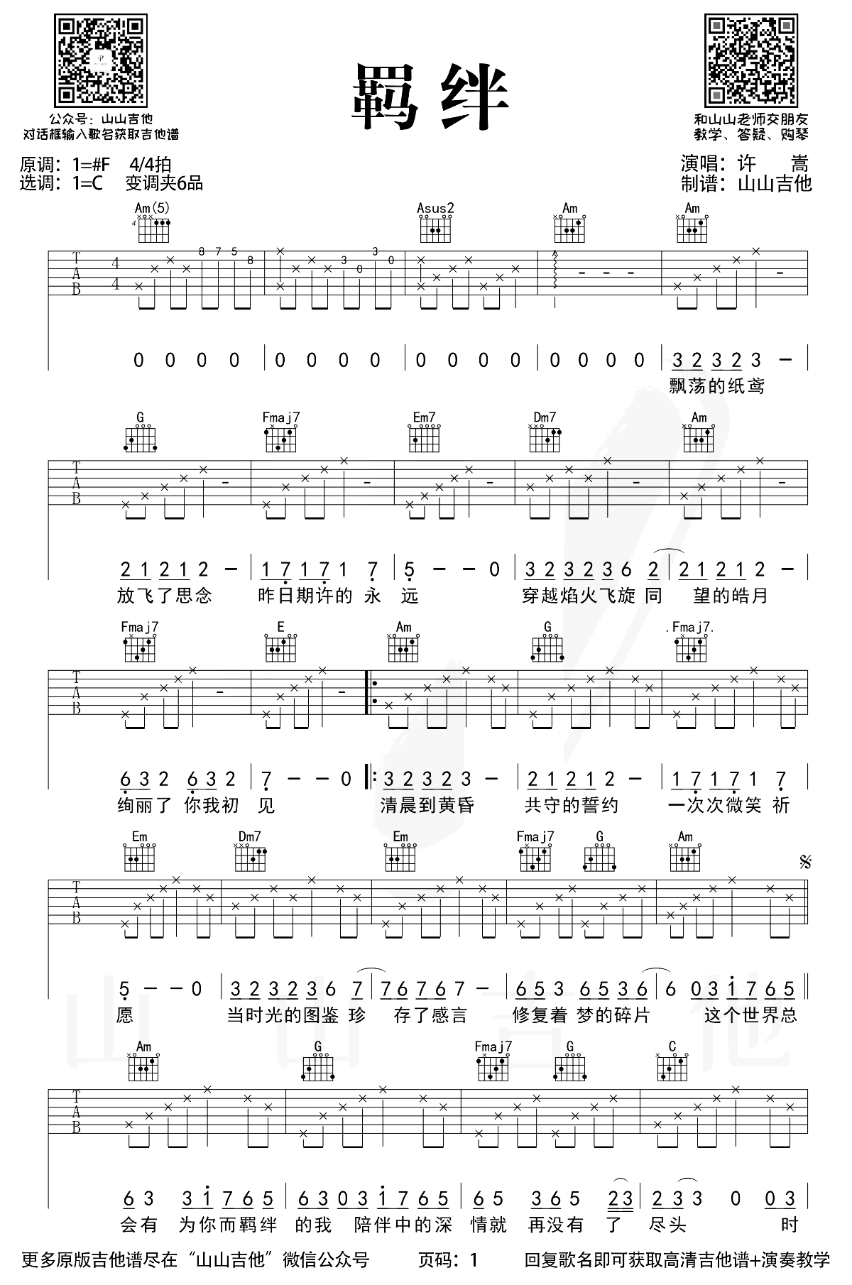 曲谱介绍: 许嵩献唱电视剧《一片冰心在玉壶》主题曲,羁绊吉他谱,原调升F选调C,变调夹六品,两张六线图片谱。随谱附上《羁绊》吉他弹唱演示和教学视频,喜欢这首歌曲的琴友们可以跟随山山老师的讲解示范练习起来。