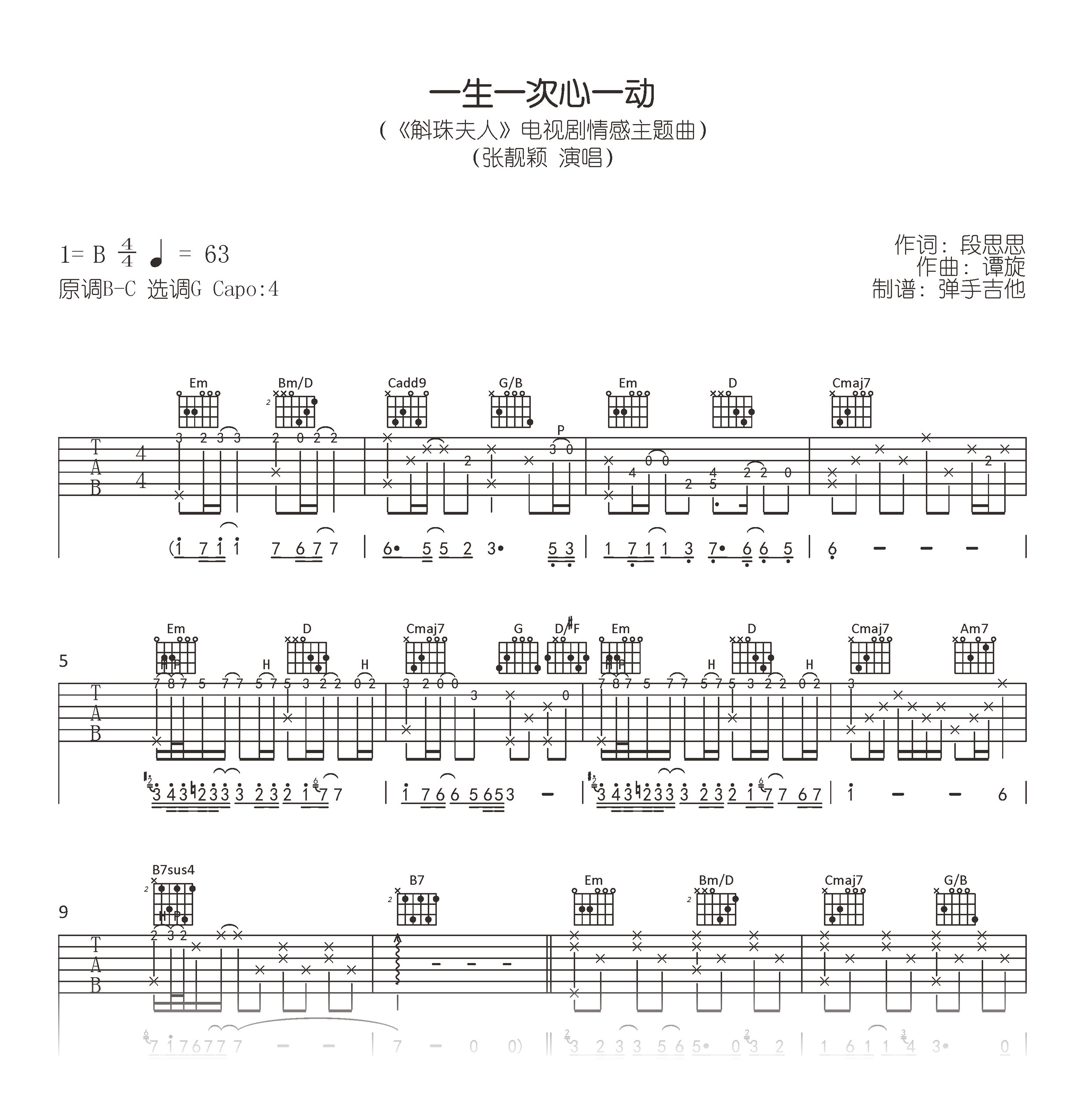 曲谱介绍: 张靓颖《斛珠夫人》电视剧主题曲,一生一次心一动吉他谱,原调B-C,选用G调,Capo夹四品。《一生一次心一动》吉他弹唱谱,完整高清图片谱共三张六线谱例,吉他帮推荐上传。