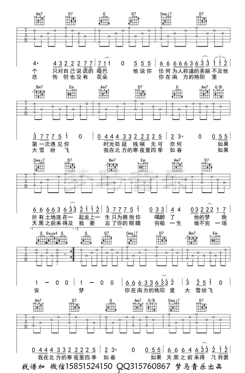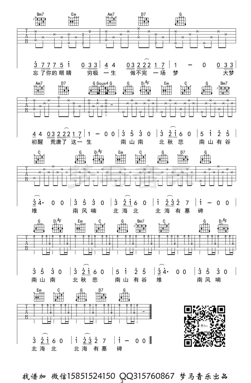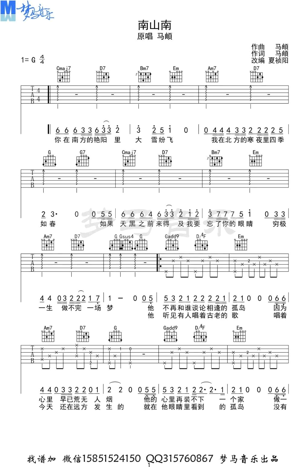 曲谱介绍: 南山南吉他谱,马頔词曲创作的一首最受欢迎的经典民谣歌曲。《南山南》吉他弹唱谱,G调指法,三张图片六线谱。谱子在基本保留原曲感觉的基础上,又把难度降到了最适合初学入门的程度。