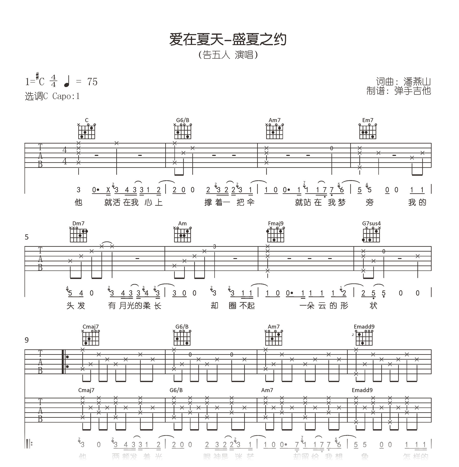 曲谱介绍: 爱在夏天吉他谱,告五人的一首新歌,唱述短暂却美好的爱情故事。《爱在夏天》吉他弹唱谱,原调升C,选调C,Capo夹一品,共四张高清图片六线谱,吉他帮更新上传。
