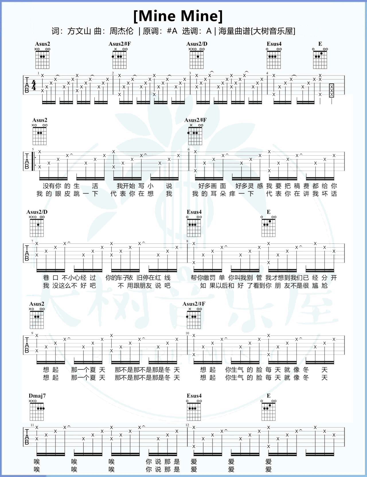 曲谱介绍: Mine Mine吉他谱,周杰伦的一首R&B曲风的甜蜜情歌,需要A调和弦指法,变调夹夹一品为原调,如果是女生,可以夹第四品,三张图片六线谱。随谱附上《Mine Mine》吉他弹唱演示和教学视频,琴友们参照橙子老师的讲解示范练习起来。前奏响起就被治愈到的歌曲,令人心动的歌词,每一句都带着"ai"~有人说这首歌是唱给异地恋的,那么,你有多久没有见到超级超级想见的人了?