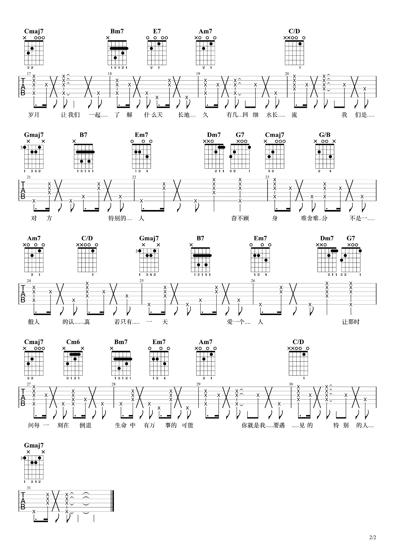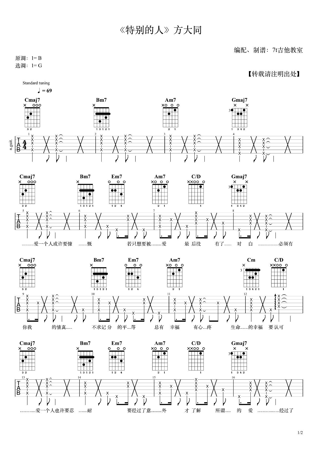 曲谱介绍: 方大同的一首经典代表歌曲,特别的人吉他谱,这首歌的原调是B大调,用的是G大调的指法来编配。《特别的人》吉他弹唱演示视频里是标准音调弦,变调夹夹在第1品。想弹原调的琴友们夹第4品就可以哦~和弦分析:和弦色彩方面,一级用了maj7;四级用了maj7,某些地方还用了四级小和弦;二级、三级、六级用了小七,其中某些地方的三级和六级还用了属七(作为副属和弦);五级用了4/5…… 歌曲有两个地方用了四级小和弦,分别是第一段主歌的结尾 Cm → C/D 还有第二段副歌的Cm6,这两个例子分别代表了四级小和弦的两种用法。 副歌的 Dm7 → G7 → Cmaj7 用了251离调,把四级当做临时主和弦的离调还是比较常见的。 主歌的 E7 → Am7 和副歌的 B7 → Em7 是副属和弦的用法,副属和弦也经常在流行歌里出现;副歌的 Cmaj7 → G/B → Am7 用了斜杠和弦 G/B,这个也是比较常见的例子。