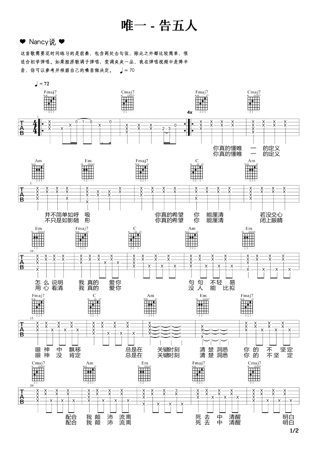 曲谱介绍: 告五人《唯一》吉他弹唱谱,共有2张高清图谱,免翻页排版设计。