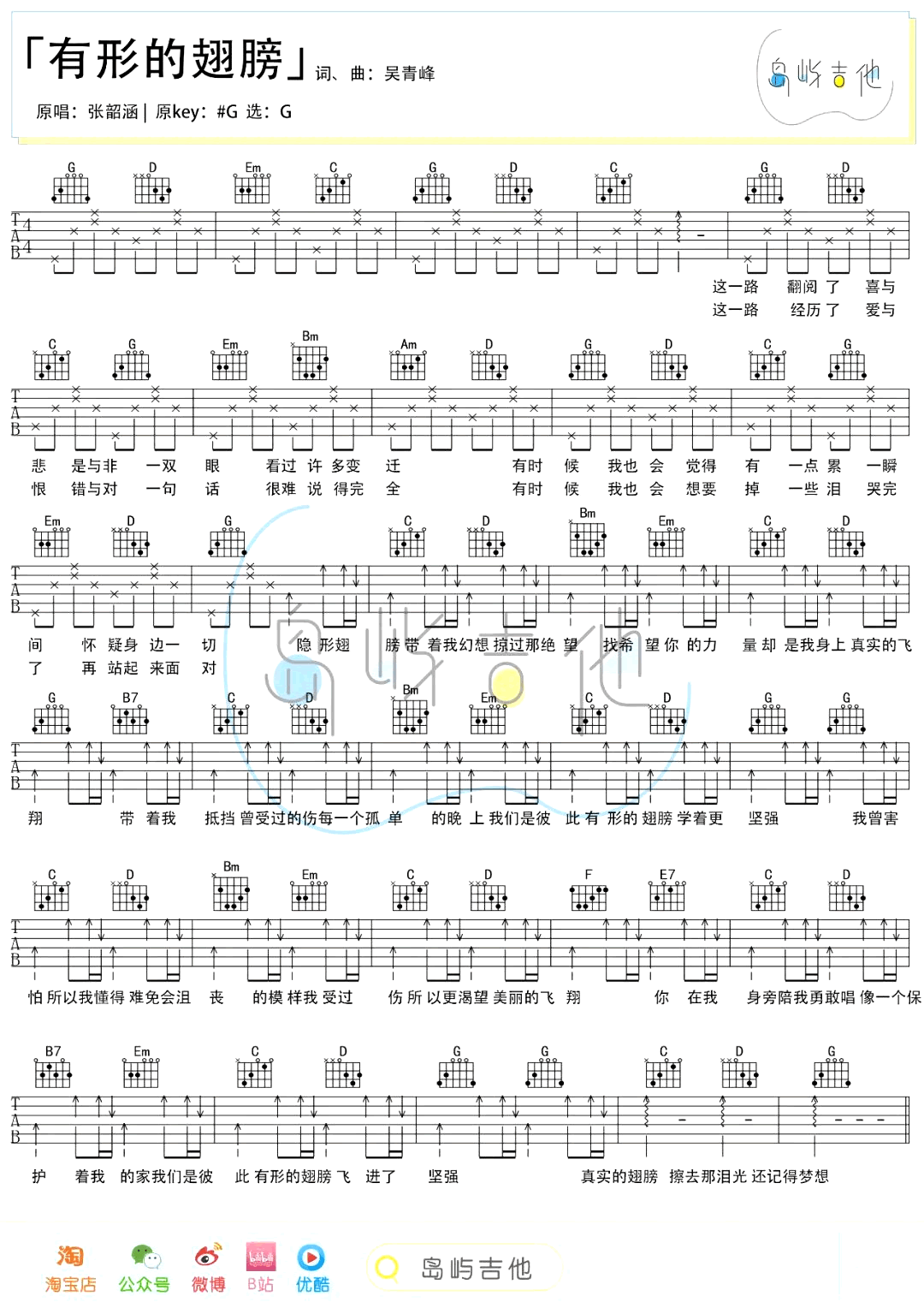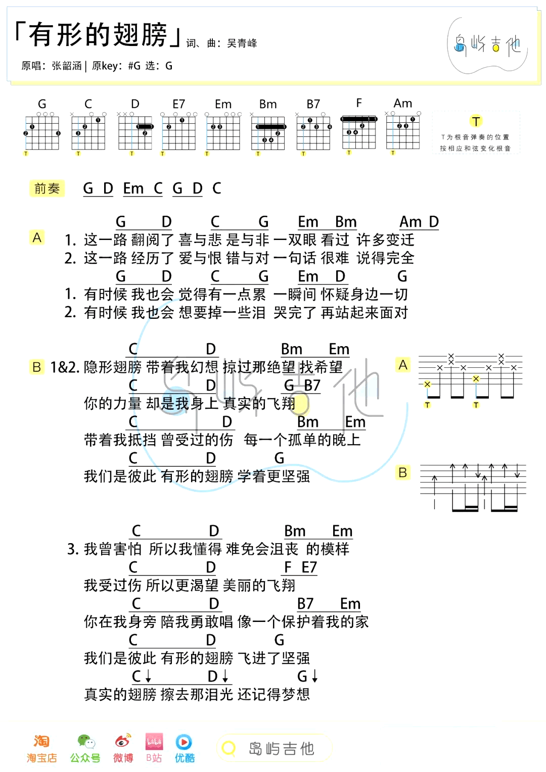 曲谱介绍: 张韶涵的一首温暖治愈充满力量的一首歌,有形的翅膀吉他谱,选用G调和弦指法,《有形的翅膀》吉他弹唱谱,和弦图片谱+六线谱。大家一定都很熟悉那首「隐形的翅膀」,曾经流行在大街小巷的热门歌曲,但今天推荐的是另一首「有形的翅膀」,亲朋好友的支持,心中的爱与关怀伴随而来的勇气,就是那一双有形的翅膀~也希望这首歌能给予更多人无形的力量。