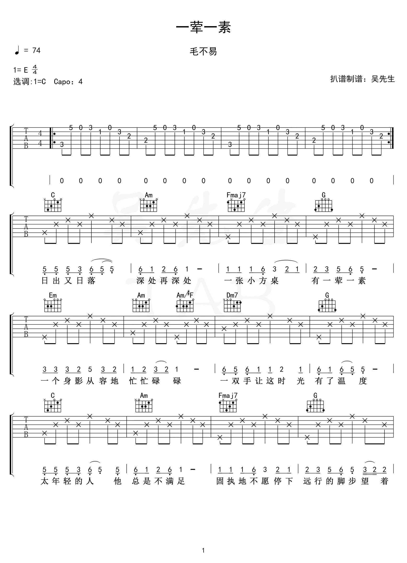 曲谱介绍: 毛不易的一首思念母亲的感怀歌曲,一荤一素吉他谱,原调E选调C,CAPO夹四品。《一荤一素》吉他弹唱六线谱,完整高清版共三张图片谱例。吉他帮整理更新。人生太多不得已,我们还未长大、还没来得及给父母好的生活,他们就已经老去了,多抱抱自己的亲人吧,一个紧紧的拥抱,一句真心的我爱你,都会成为我们心中温暖的回忆。