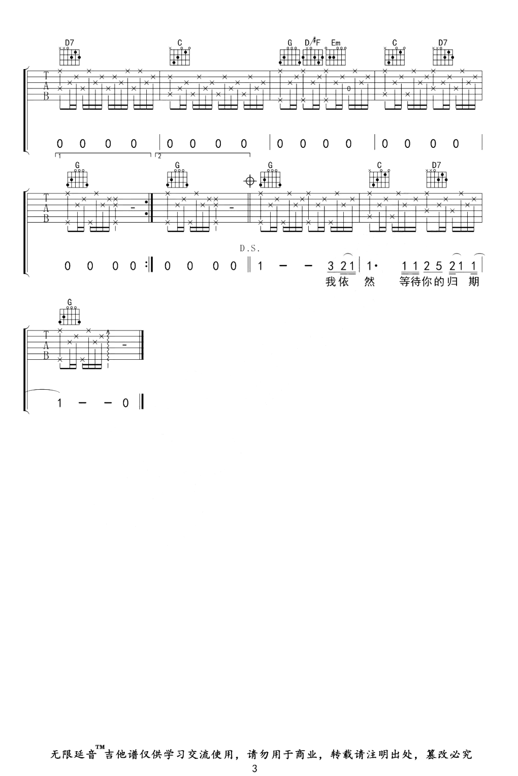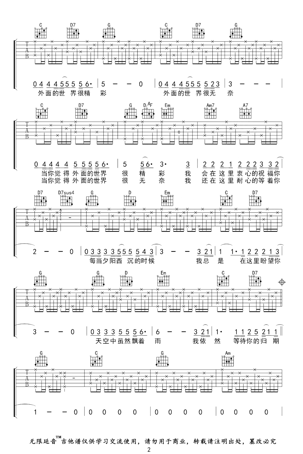 曲谱介绍: 齐秦早期一首带着淡淡忧愁与感伤的经典怀旧歌曲,外面的世界吉他谱,G调和弦指法编配,《外面的世界》吉他弹唱谱,三张图片六线谱。