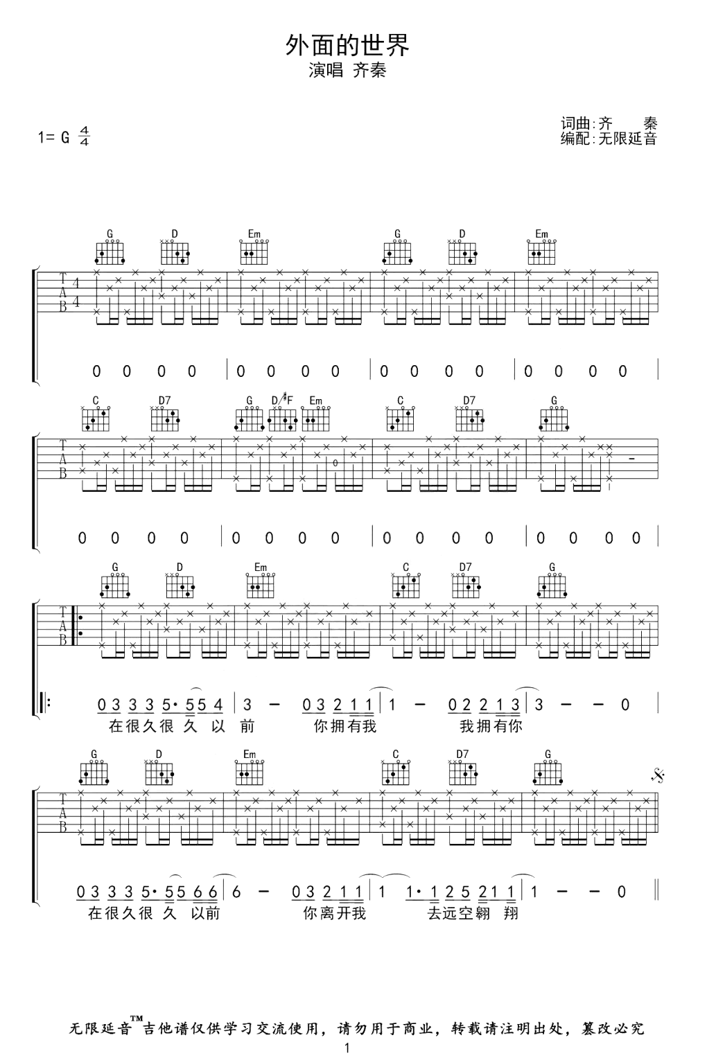 外面的世界吉他谱 - 齐秦 - G调吉他弹唱谱