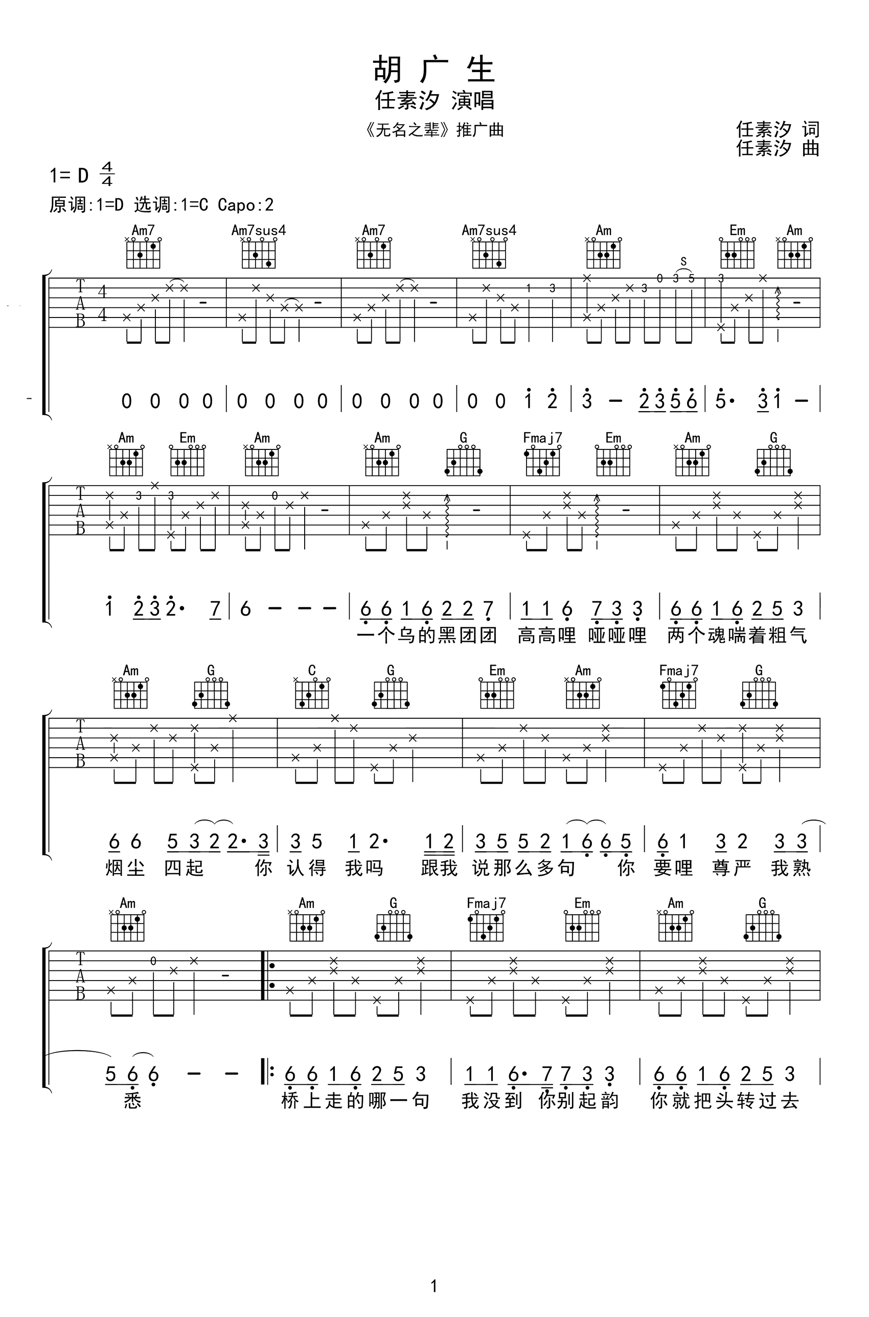 曲谱介绍: 任素汐为其主演的电影《无名之辈》创作演唱的推广主题曲,胡广生吉他谱,原调D选调C,变调夹二品,《胡广生》吉他弹唱六线谱,三张高清图片谱例。