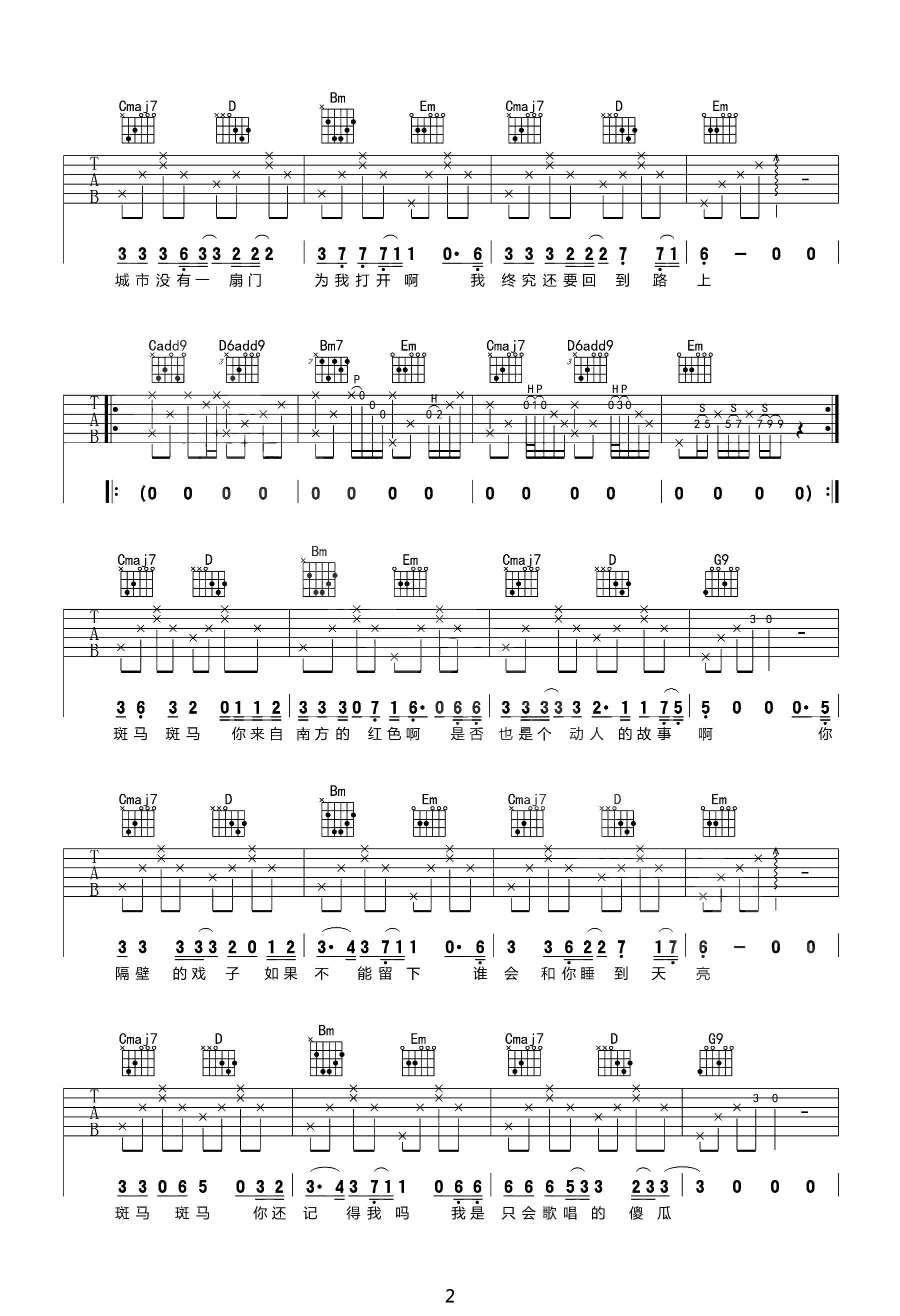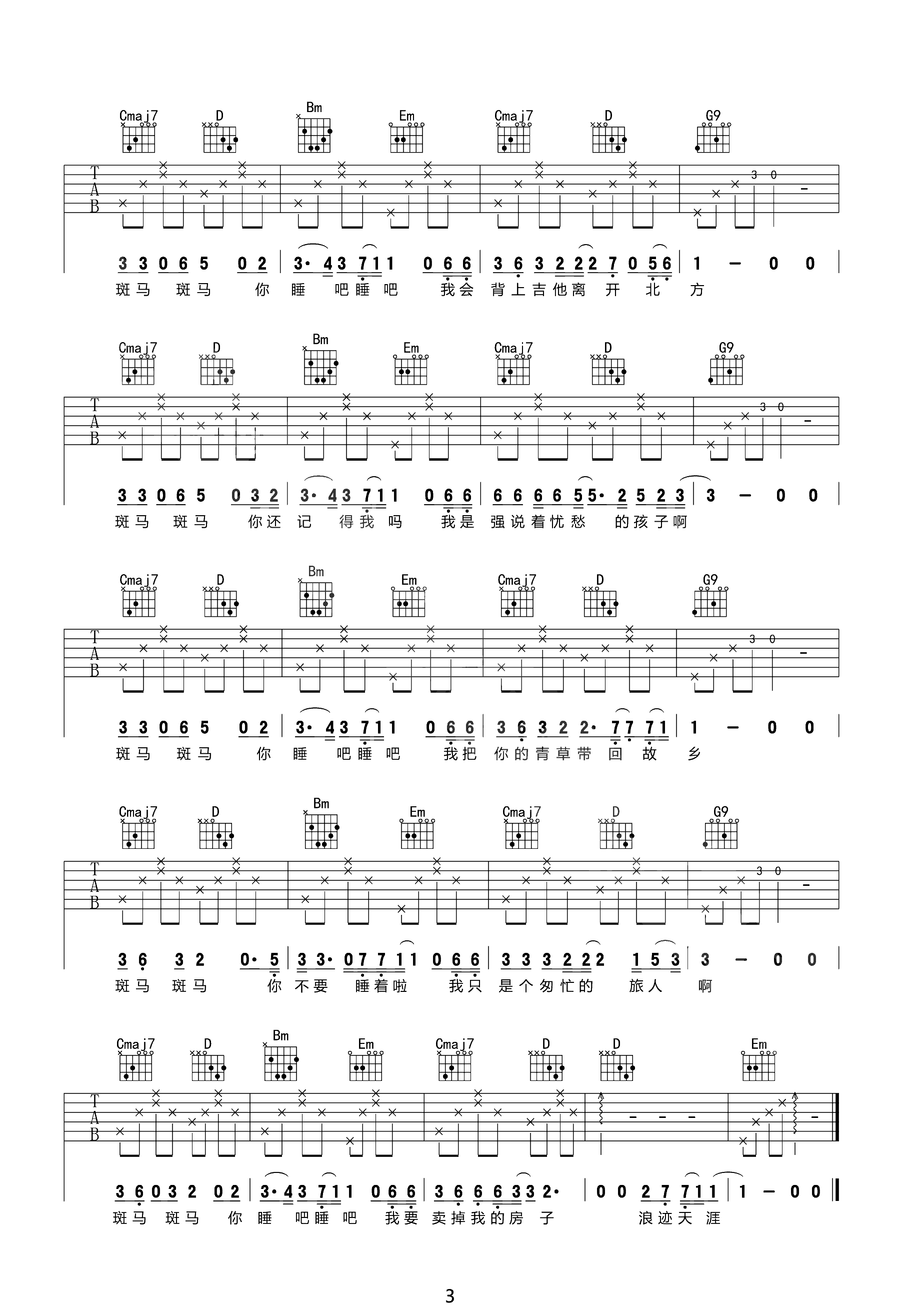 曲谱介绍: 宋冬野的一首经典代表民谣作品,关于流浪和爱情的悲伤故事。斑马斑马吉他谱,选用G调原版编配,《斑马斑马》吉他弹唱六线谱,三张图片谱例。