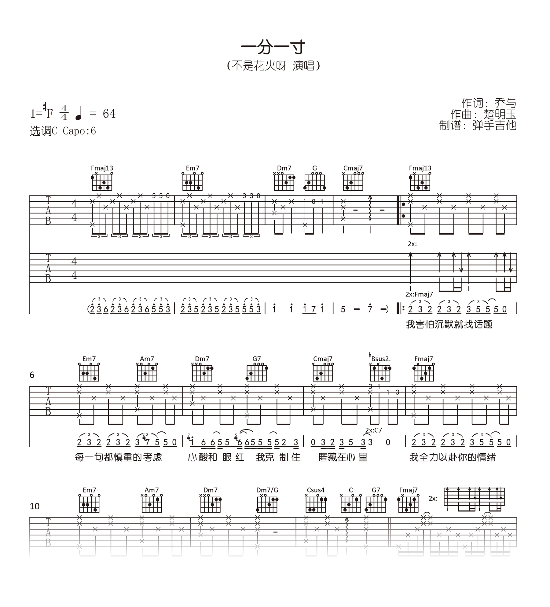 曲谱介绍: 不是花火呀翻唱,阿YueYue的一首网络歌曲,一分一寸吉他谱,原调升F,选用C调指法编配,变调夹夹六品,《一分一寸》吉他弹唱谱,高清完整版共两张图片六线谱。