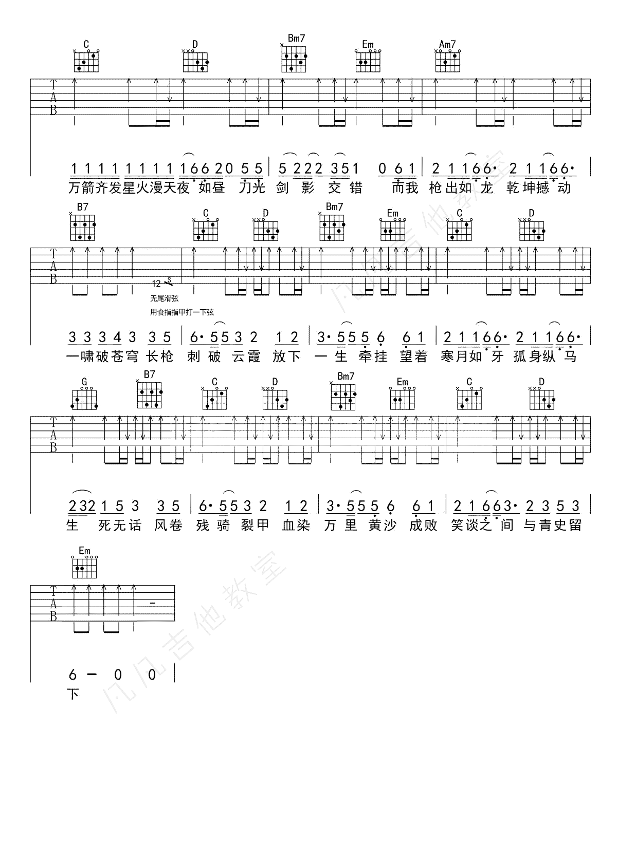 曲谱介绍: 踏山河吉他谱,是七叔呢演唱的一首热门网络古风歌曲,选用G调和弦指法,和弦部分2个比较难Bm7和B7,副歌前的12品滑弦,谱子有指出如何弹奏,如果觉得不适应,可以不滑弦,直接停一拍。附上《踏山河》吉他弹唱视频。仗剑破空刺云霞,万里黄沙山河踏,一首气势恢宏的歌曲,豪迈的旋律,热血的歌词,舒展出一幅万马奔涌狼烟滚滚的疆场画面。