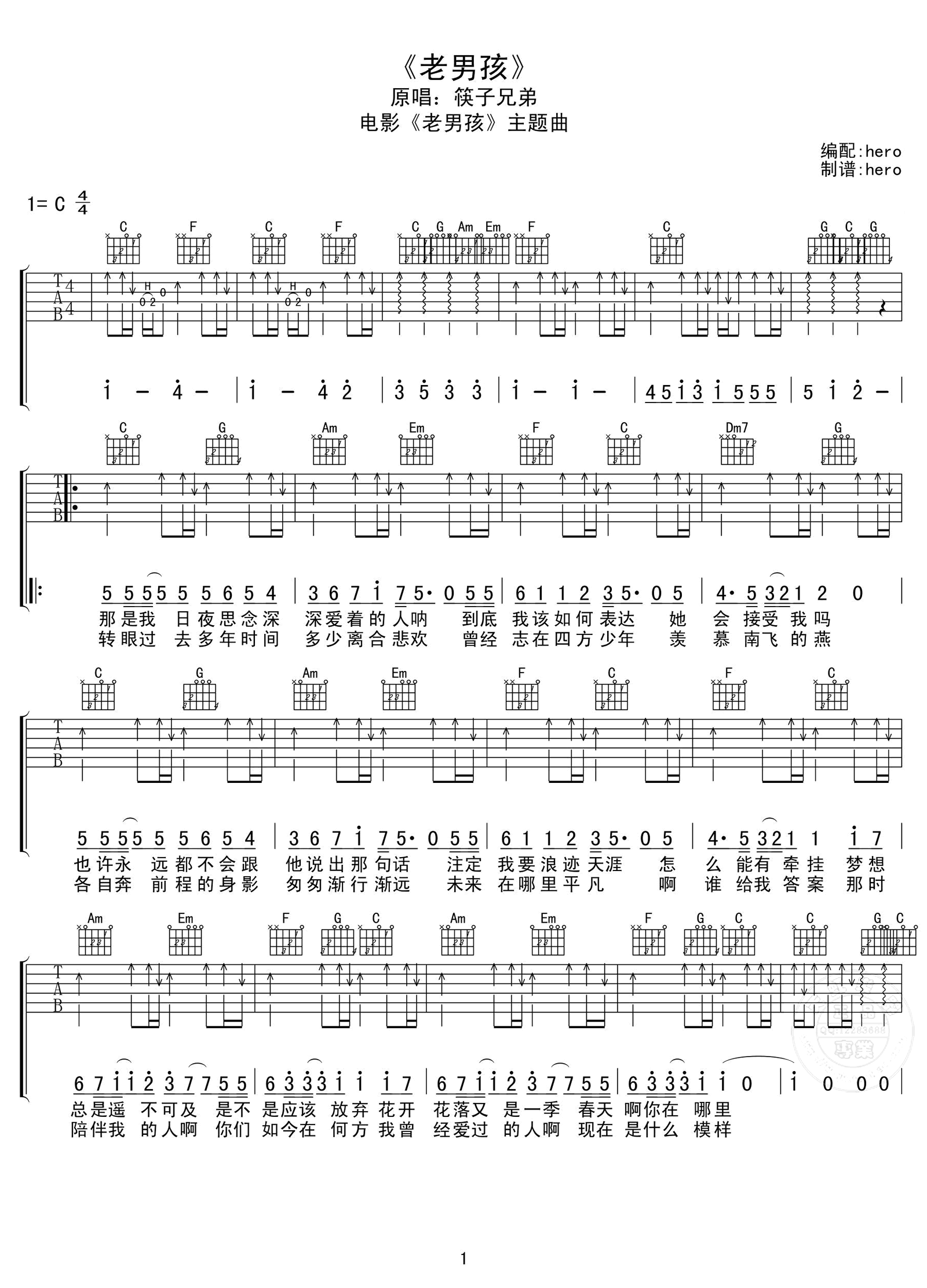 老男孩吉他谱 - 筷子兄弟 - C调吉他弹唱谱