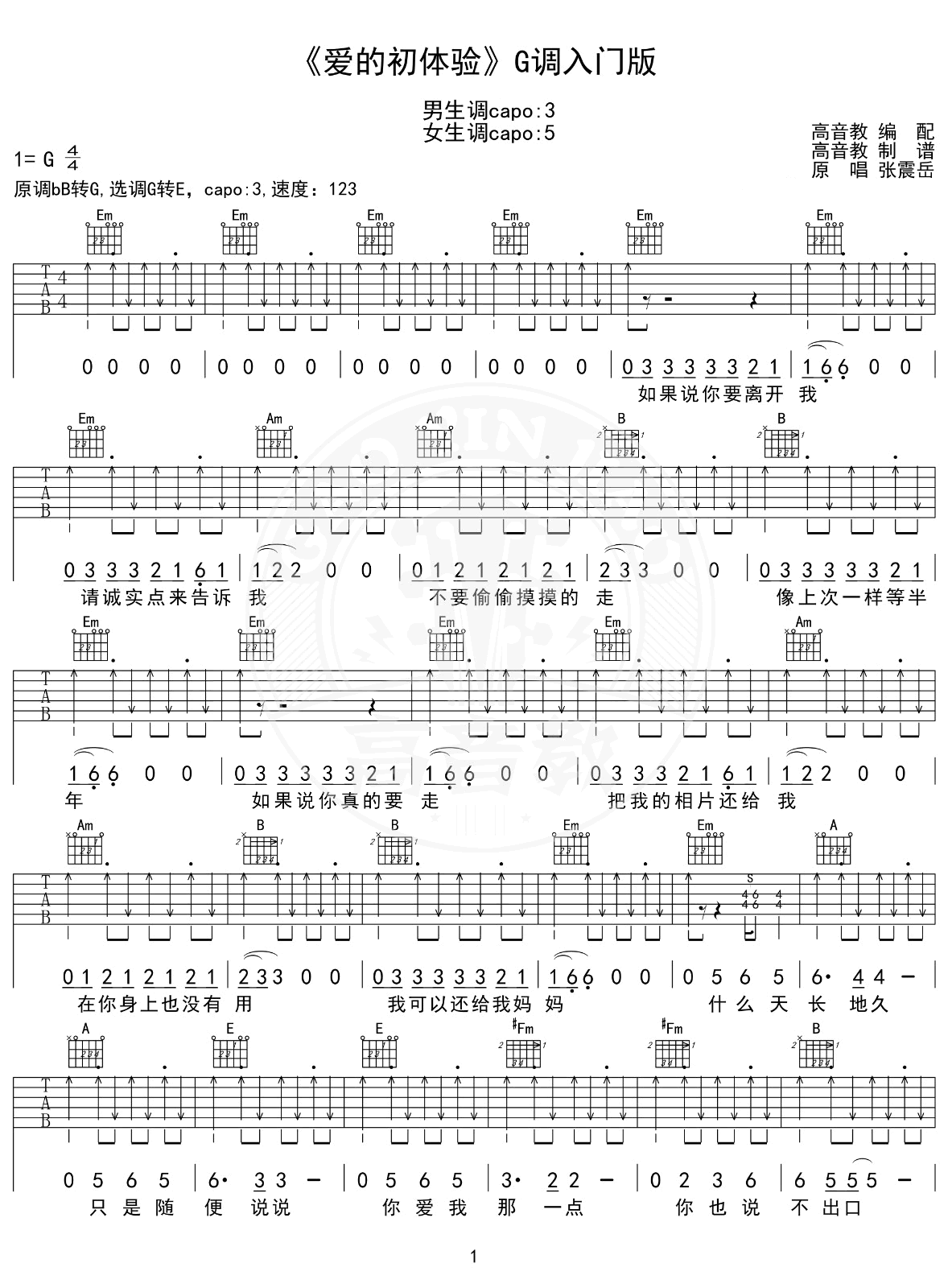 曲谱介绍: 张震岳的成名代表歌曲,爱的初体验吉他谱,选用G调指法入门版编配,变调夹男生推荐夹三品,女生建议夹五品。《爱的初体验》吉他弹唱谱,两张图片六线谱。